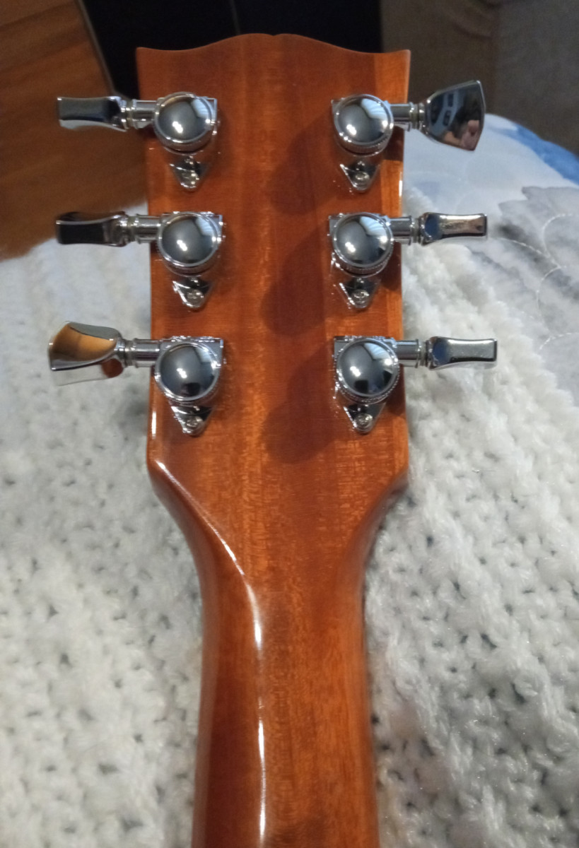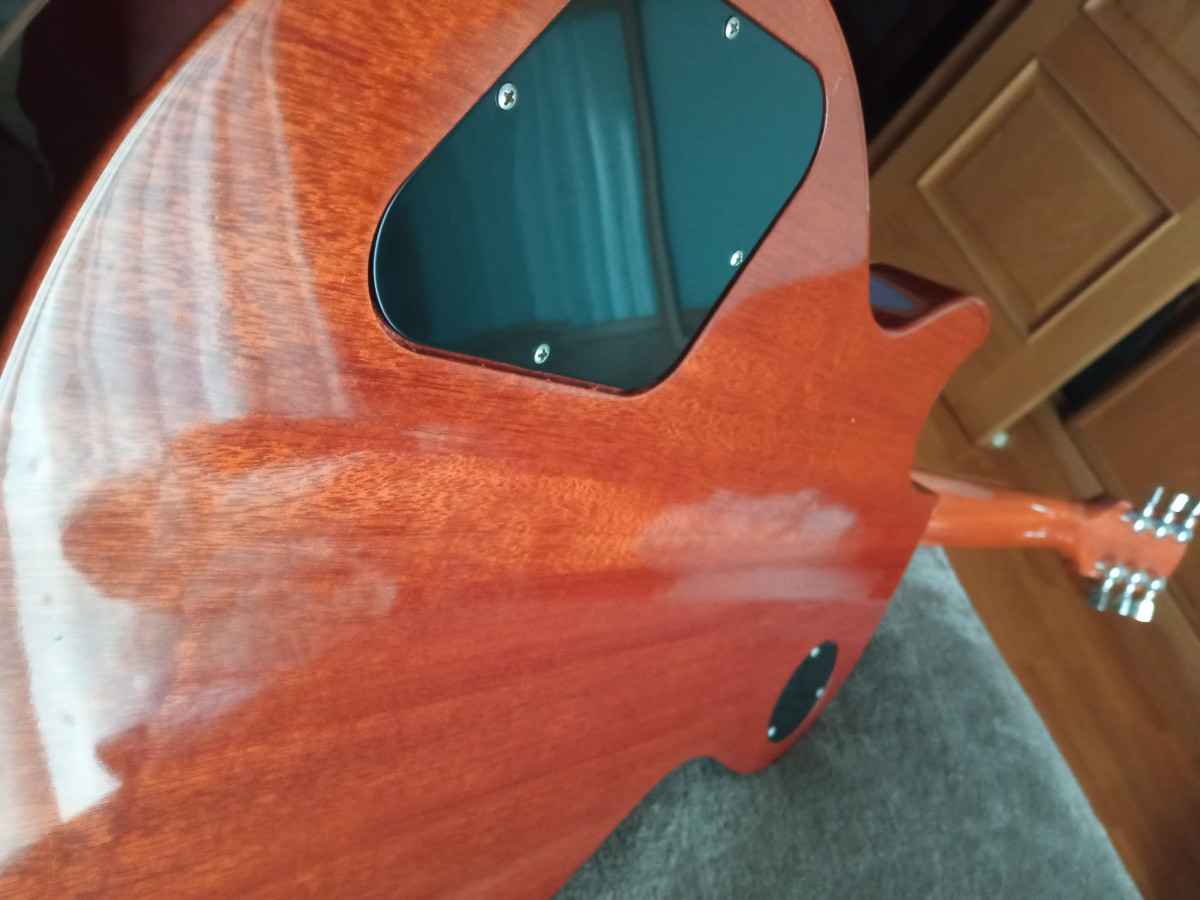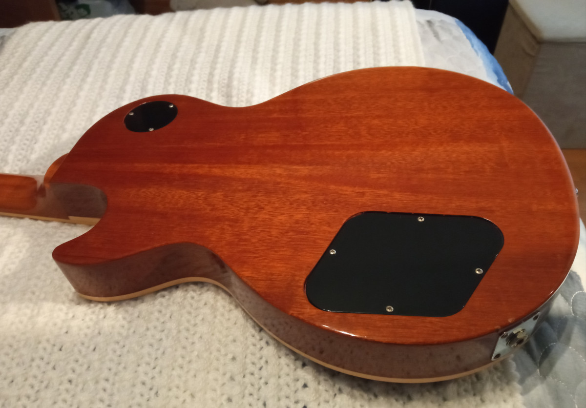 Cuerpo de caoba de 2 piezas a la mitad, tapa de arce, con alivio de peso de los 9 agujeros.