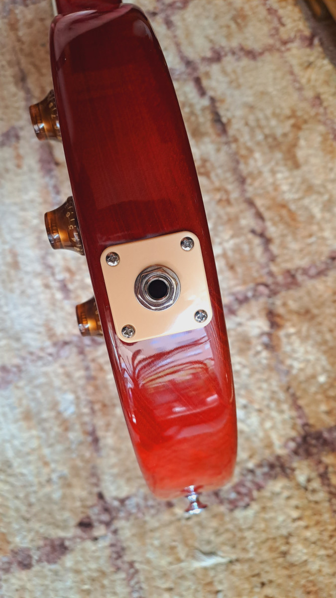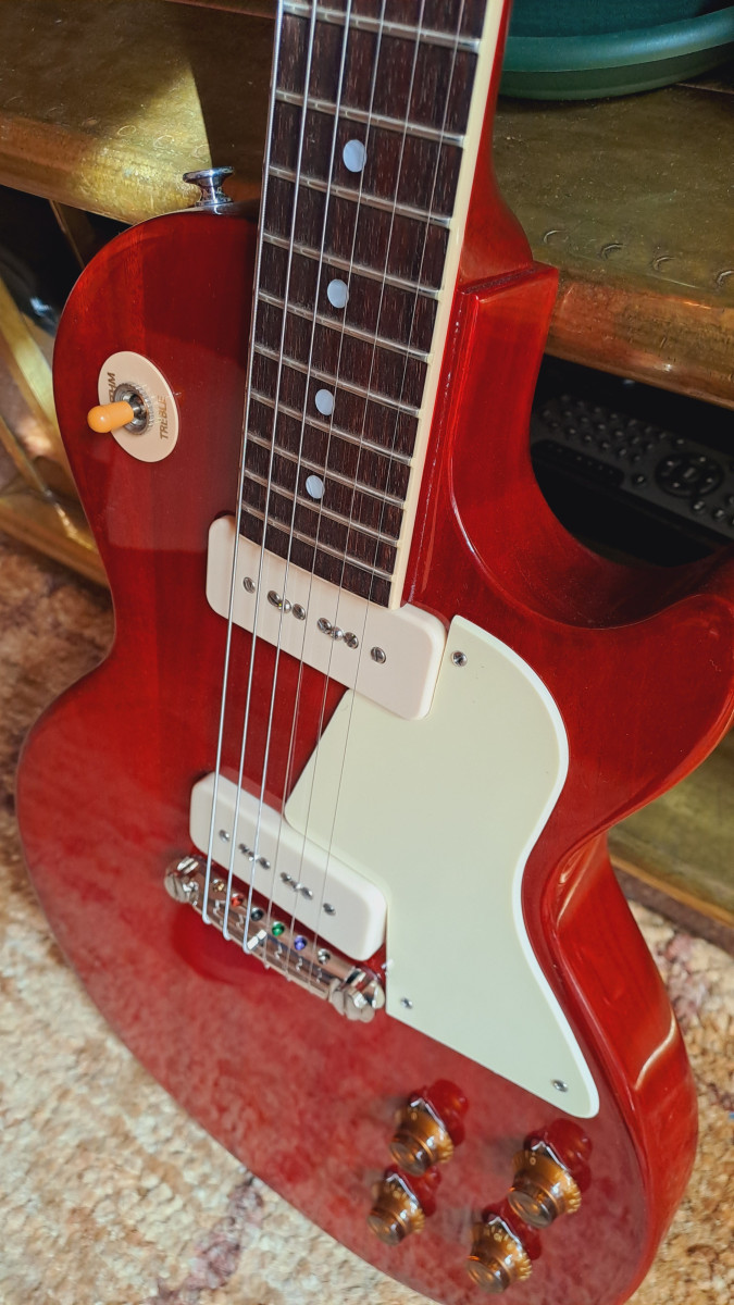 El cuerpo de caoba tiene una veta muy bonita. El acabado Vintage Cherry es un poco menos "pintón" que el TV Yellow con el que también está disponible. Y la laca nitro brillante le aporta ese toque vintage que combina perfectamente con el acabado niquelado de los herrajes.