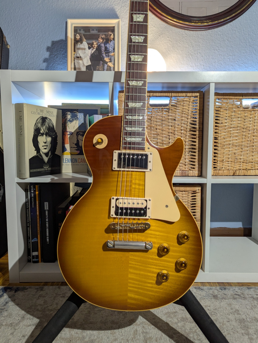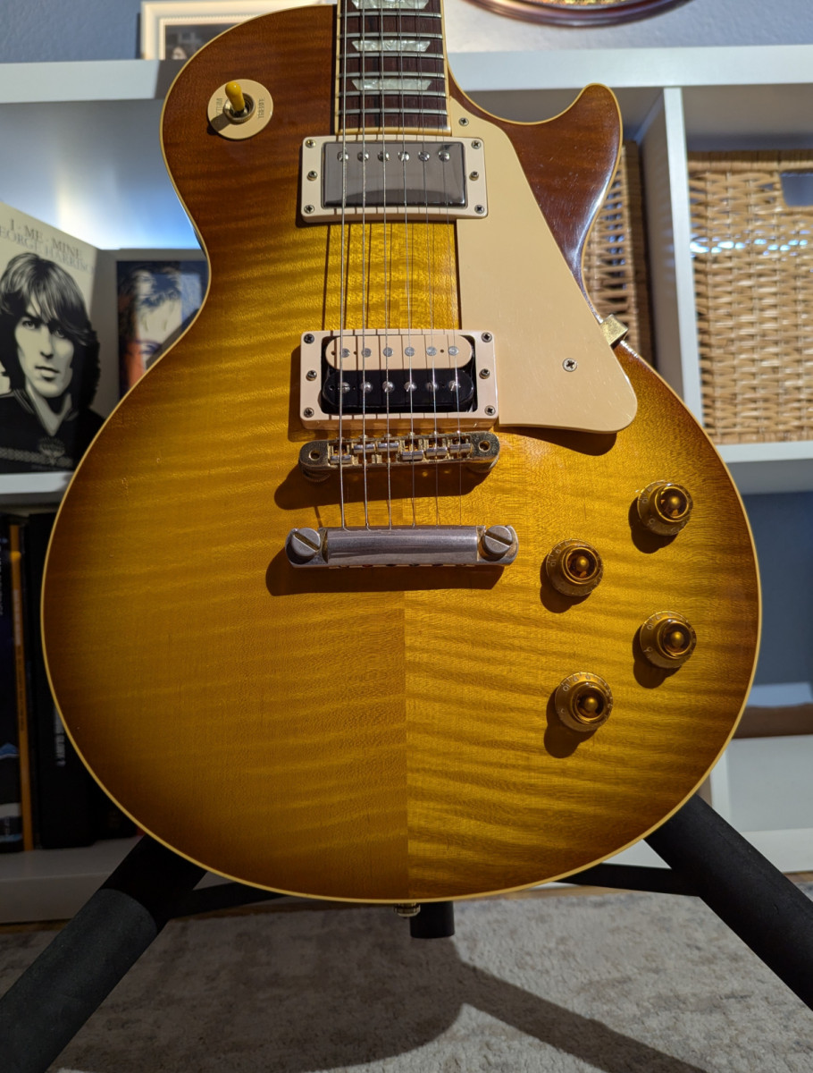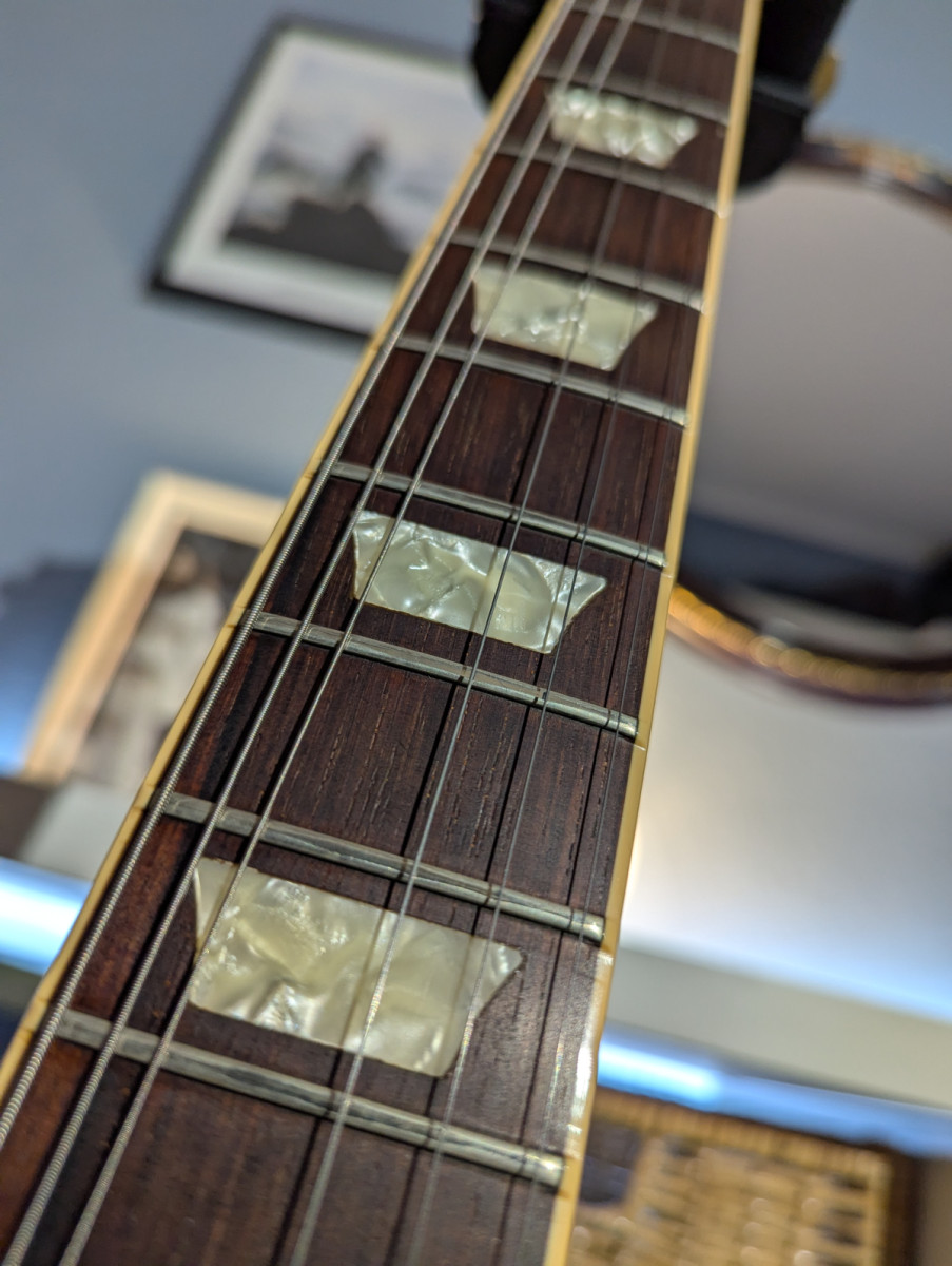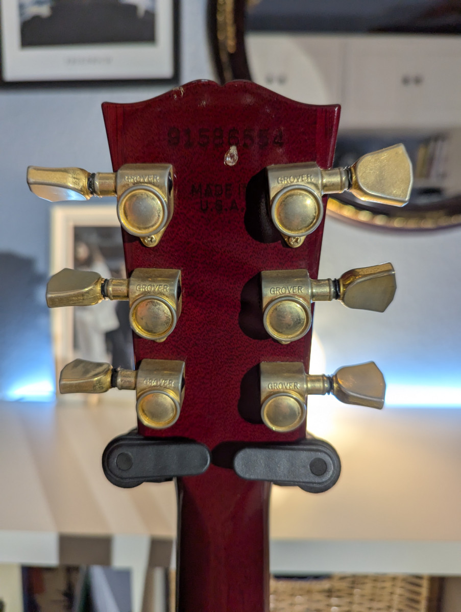 La guitarra se toca y suena de maravilla: tonos de auténtica Les Paul, mástil fino pero sin llegar a ser delgado, y afinación y entonación más que correcta (clavijero Grover original). Y gracias al sistema de push pull que mencionaba antes, se pueden conseguir hasta 21 tonos diferentes (pasar de humbucker a single, serie o paralelo, fuera de fase a lo Peter Green...). En fin, una delicia.