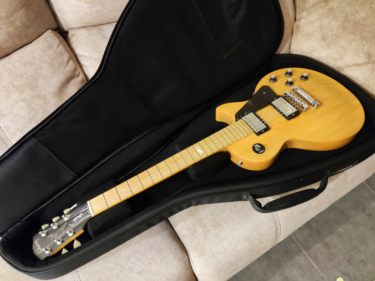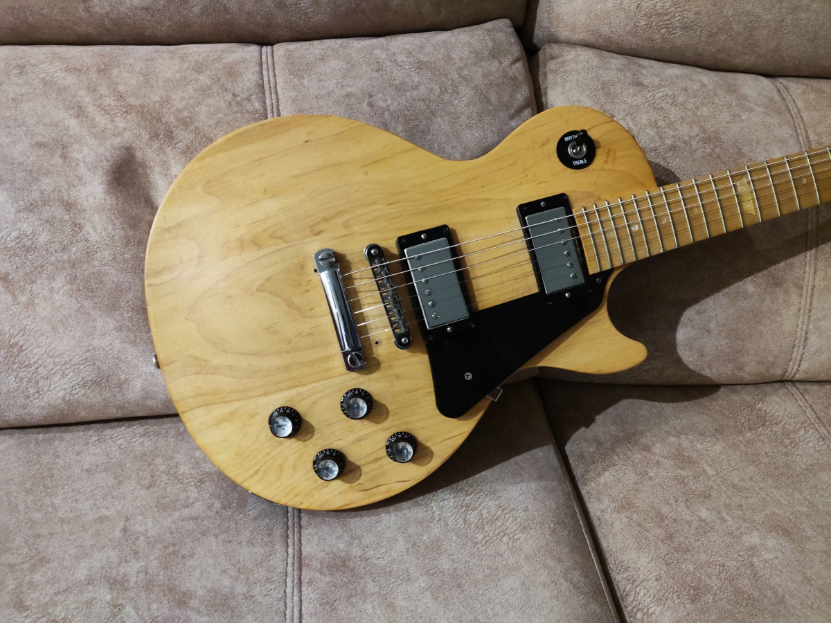 Gibson Les Paul Studio Raw Power del año 2009. Este modelo se fabricó solo desde el 2009 hasta el 2012 y se diferencia del resto porque todas sus maderas son de arce, no solo la tapa, sino también el cuerpo, mástil y diapasón. Suena muy bien con mucho cuerpo y resonancia y el tono es similar de una LP normal, pero es un poco más brillante y las notas suenan más nítidas y cristalinas. Tiene un peso muy bueno, 3,85Kg que para ser una LP está muy bien. Antiguamente, era de un color verde oscuro muy feo y su anterior dueño le quito la pintura y le dio varias manos de aceite de linaza y cera virgen. Tiene un tacto muy sedoso y el mástil desliza super bien, aunque tiene en el cuerpo y el mástil algunas marcas de cuando se quitó el antiguo color, pero solo marcas estéticas. También lleva los agujeros de haber llevado un Bigsby B7 que instalo en algún momento su anterior propietario. Los trastes están en perfecto estado, sin marcas visibles. Las pastillas son ambas las Classic 57, un tonazo que tira para atrás, tanto en limpio como en gain.