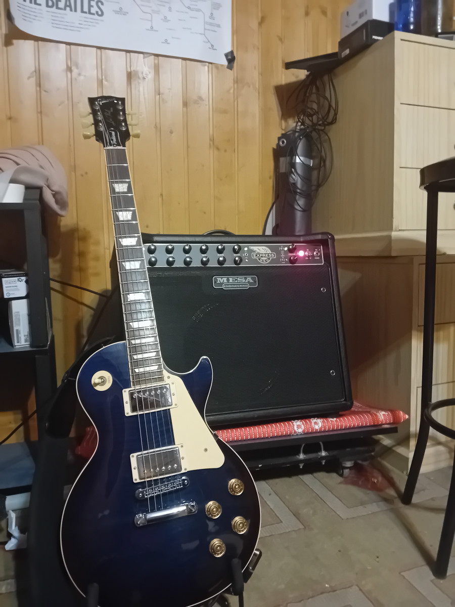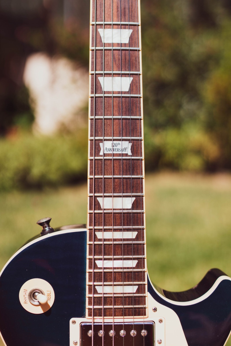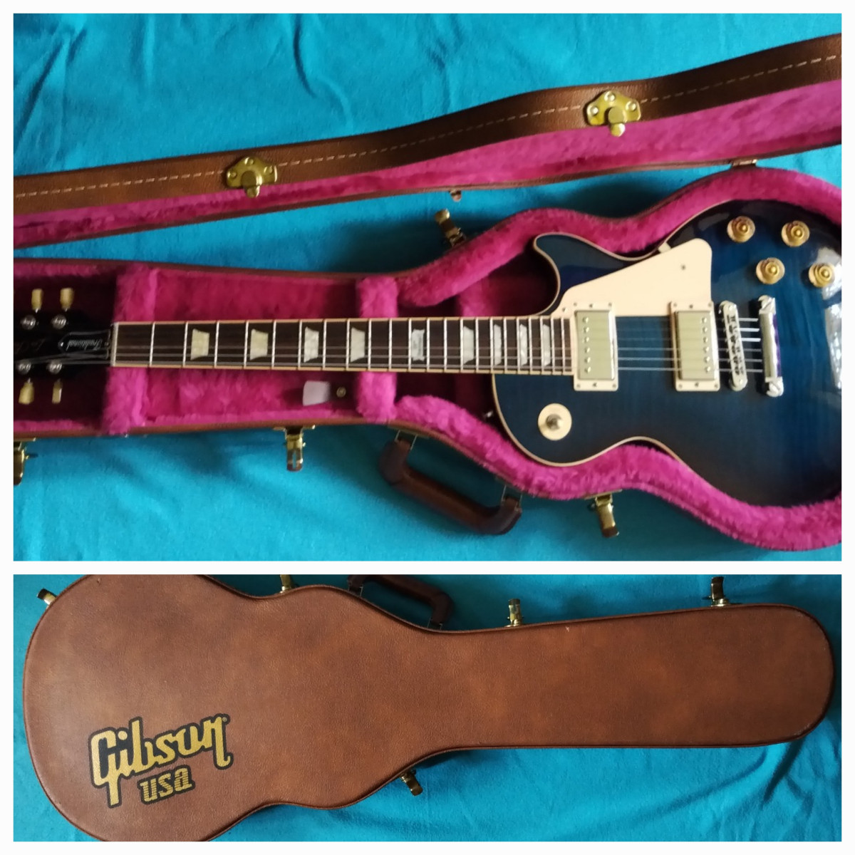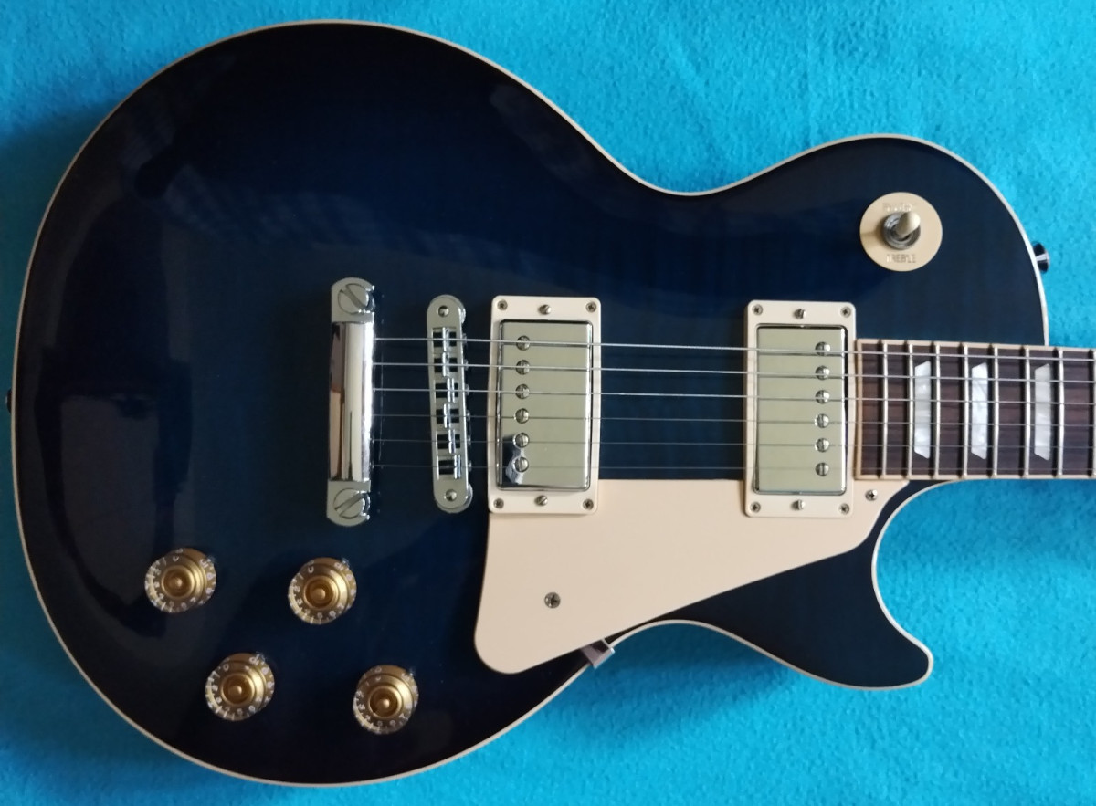 Es una Gibson Les Paul Traditional 2014, en un alucinante acabado Manhattan Midnight; pesa 4,25kg, sin weight relief, ni laminados en el mástil. Un top flameado precioso que fácilmente podría estar en una custom. Este color azul intenso le sienta como un guante y se acompaña tanto en la tapa como la parte trasera.