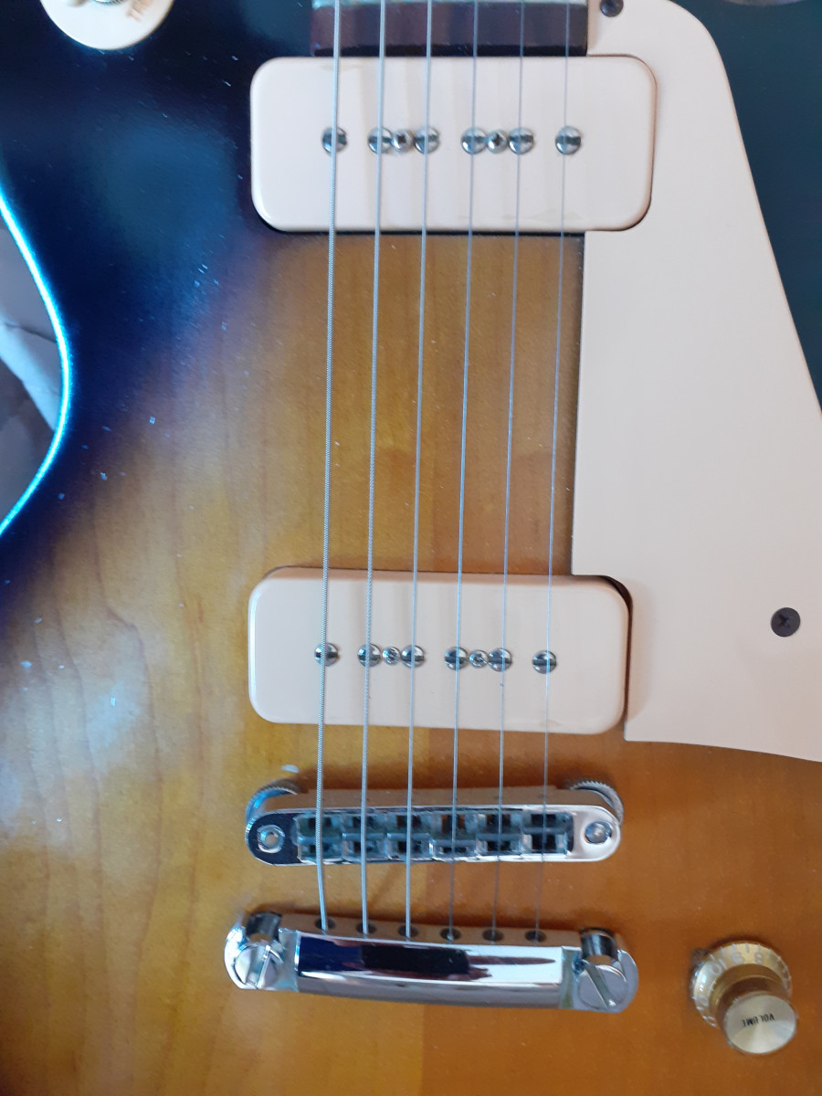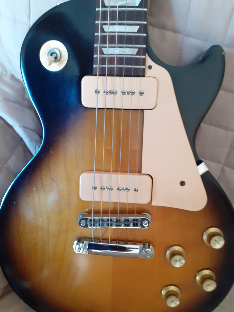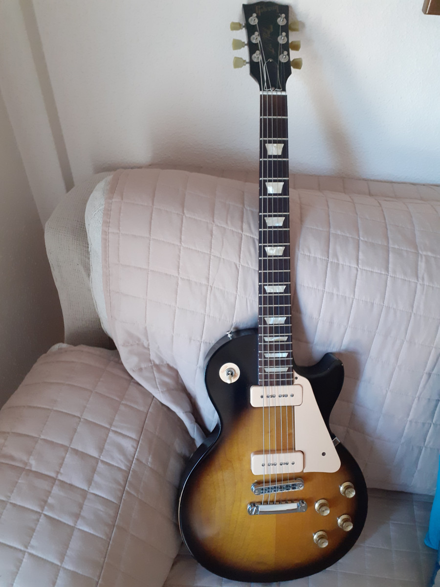 Es una Tribute en Tobacco sunburst (o eso creo, no estoy seguro cómo se llama este color), del 2013 con un poco de relic natural, muy cómoda, ligera y perfecta de ajuste (al menos para mí). El mástil creo que es tipo 60 (que no es gordo) y las pastillas p90 muy rockeras, se las cambié por lollar y al final las quité porque las originales molan más a mi parecer.