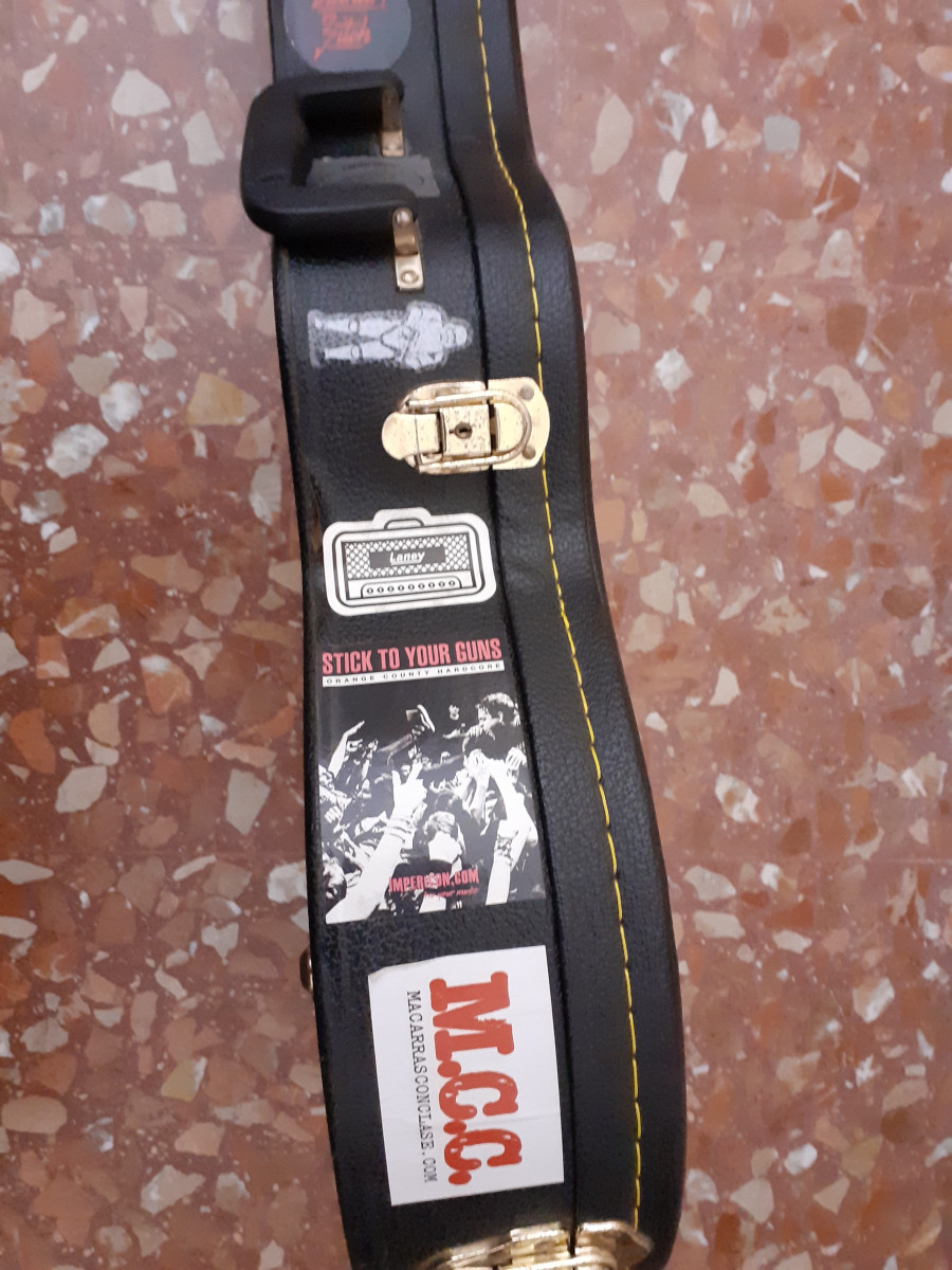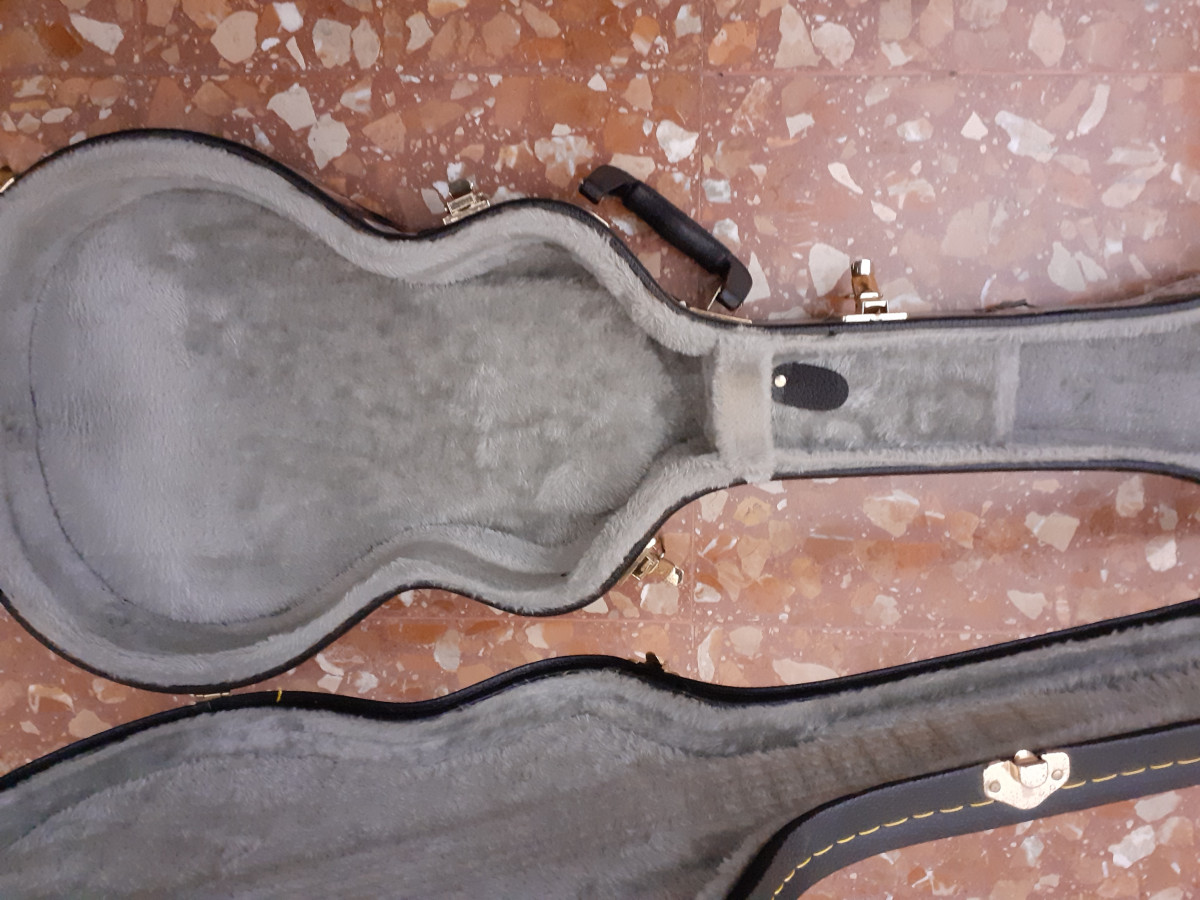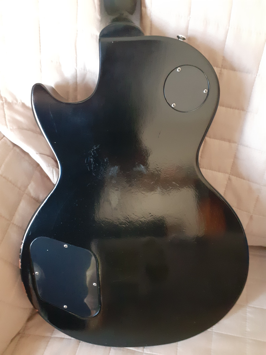 Es una Tribute en Tobacco sunburst (o eso creo, no estoy seguro cómo se llama este color), del 2013 con un poco de relic natural, muy cómoda, ligera y perfecta de ajuste (al menos para mí). El mástil creo que es tipo 60 (que no es gordo) y las pastillas p90 muy rockeras, se las cambié por lollar y al final las quité porque las originales molan más a mi parecer.