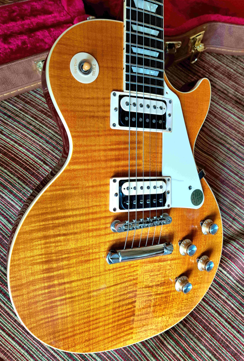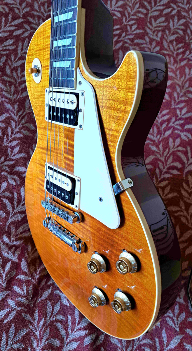 El Cuerpo y la Tapa: Calidad Inigualable: La Gibson Les Paul Standard de la Colección Slash cuenta con una tapa de Arce flameado grado AAA que no solo le otorga una estética impresionante, sino que también influye en su sonido característico. El cuerpo está construido en Caoba maciza sin aligeramiento de peso, lo que proporciona una resonancia profunda y una sensación de solidez en las manos. Esta combinación de maderas de alta calidad es la base de un tono excepcionalmente rico y cálido que ha sido la firma de las Les Paul durante décadas.