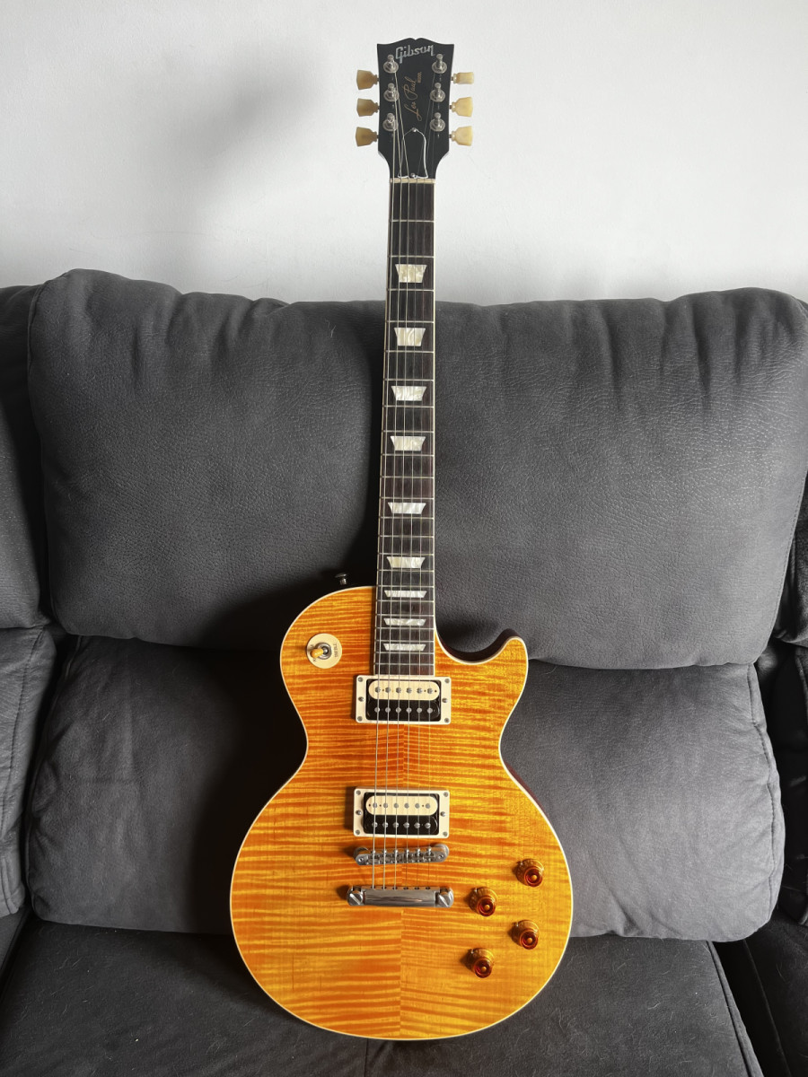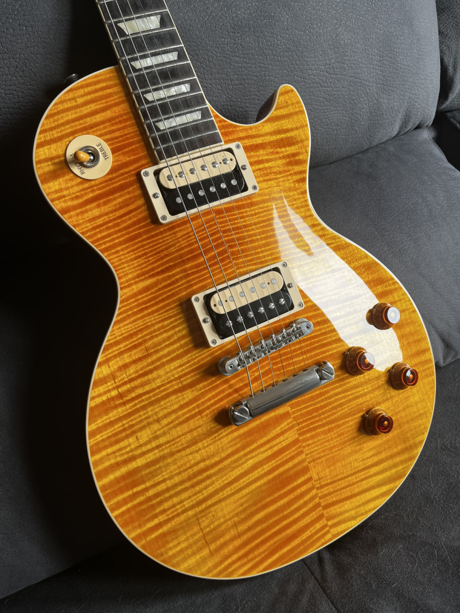 Buscaba una les paul 50s en Honey lemon o Lemon drop y como por trabajo en esa epoca viajé mucho me dedique a ir por un montón de tiendas por España , Francia e Italia adelante buscando un ejemplar lo más perfecto posible, ya sabéis que no tuviese esos desajustes de altura en el binding ni derrames del tinte o fallos en el grosor del lacado , que tuviese una tapa preciosa, un diapasón impoluto con un color 10 y unas maderas de tapa y cuerpo con una veta bonita y ese mastil 50s cómodo y rellenito y que sonase lo mejor posible, sin problemas en la estabilidad de la afinación que no pesase mas de 4kg, etc etc, ya sabeis.....