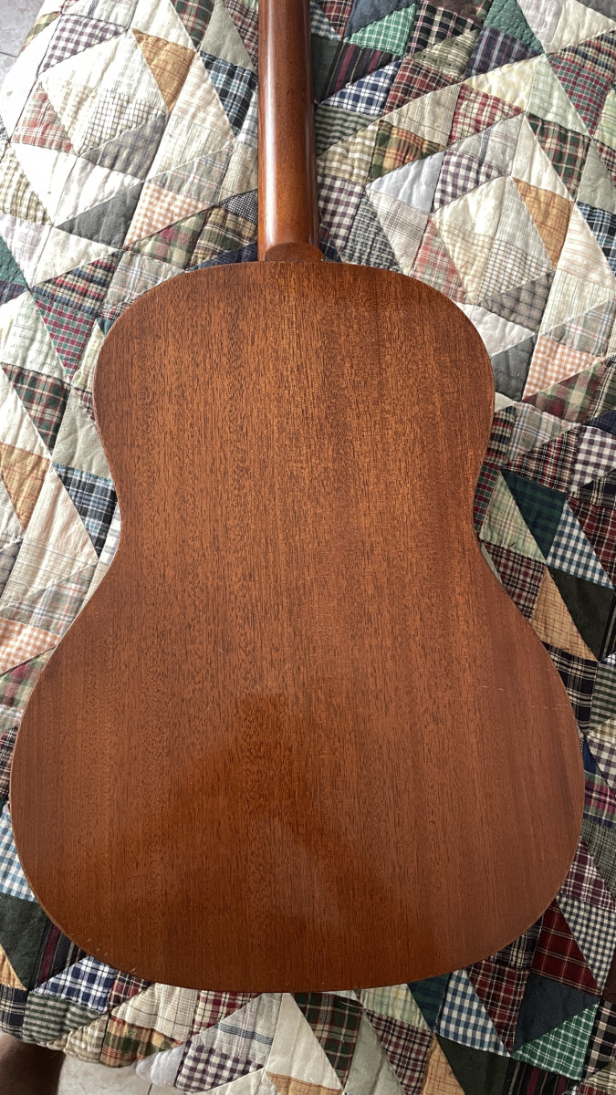LG-0: 14 1/8" wide, all-mahogany body, mahogany top, straight-across ladder bracing, rectangular rosewood bridge, black bridge pins, screwed-on teardrop pickguard, tortoise-shell celluloid binding on top and back, 24 3/4" scale, 20 frets, rosewood fingerboard, dot inlay, decal logo, 3-on-a-plate tuners, natural mahogany finish.