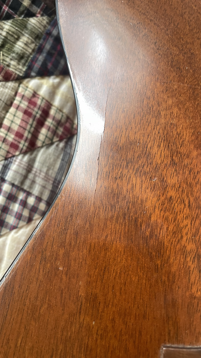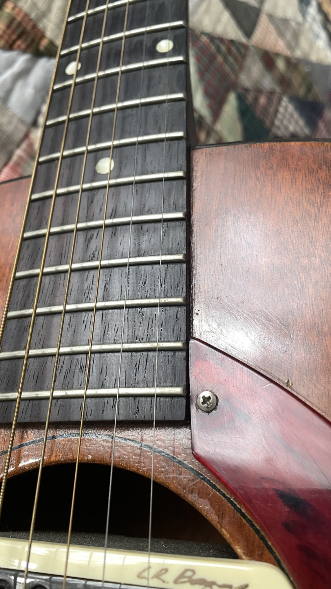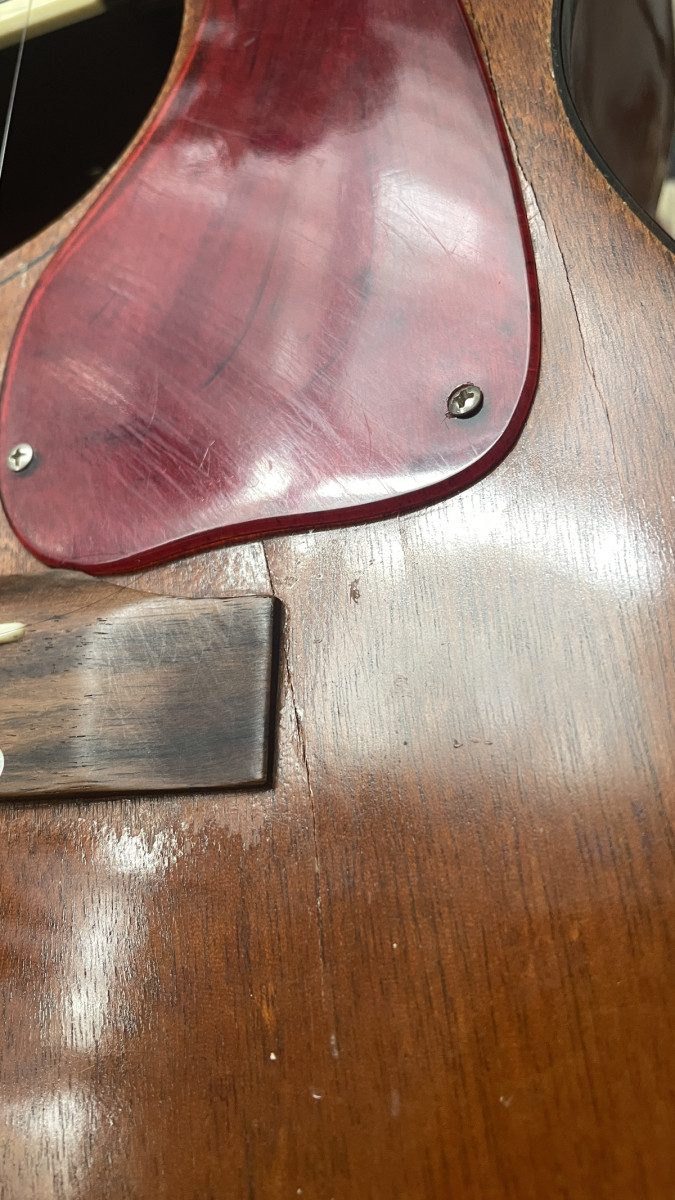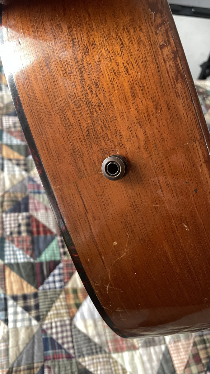 En algún momento fue restaurada por alguien que sustituyó el fondo de la guitarra y dejó su etiqueta (un tal Tommy Bond Guitars). Tiene unas grietas en la tapa pero no afectan a su sonido y parecen estar pegadas también. A mi me llegó así. Tiene instalada una LR Baggs M1. Está currada obviamente. No es una guitarra para coleccionistas, esta es para tocarla.