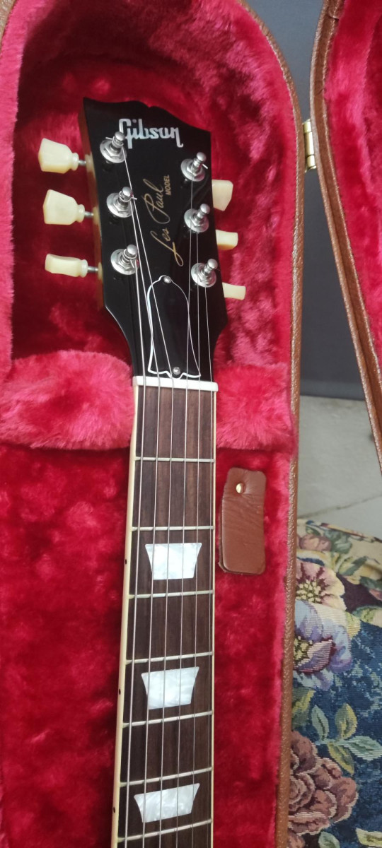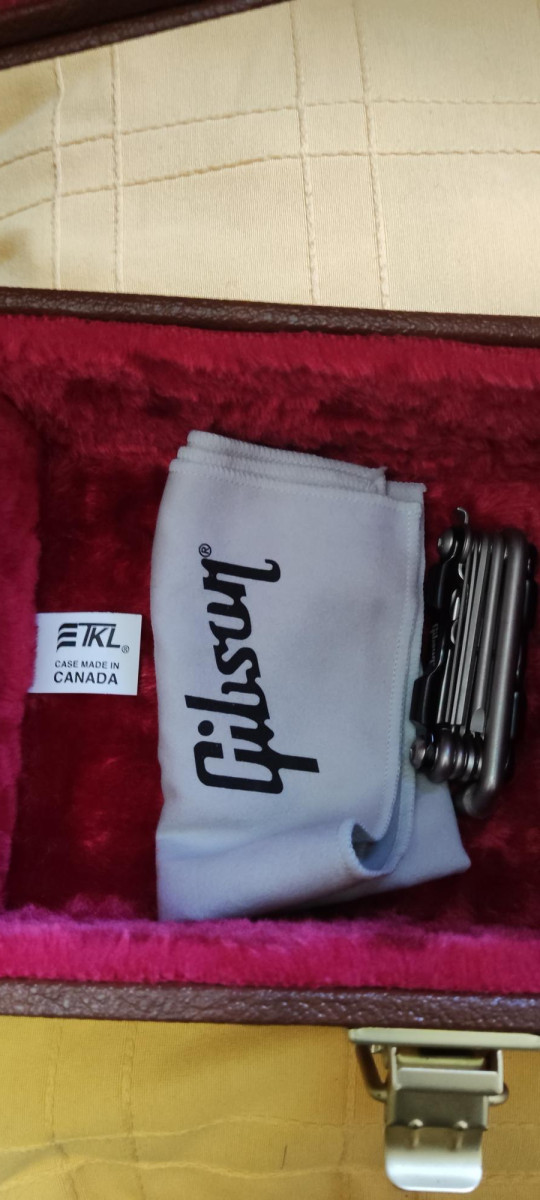Maleta made in Canada, golpeador crema, tapa alma Standard + tapa sin logo, correa Gibson, llave ajuste multiusos, papeles y foto.
