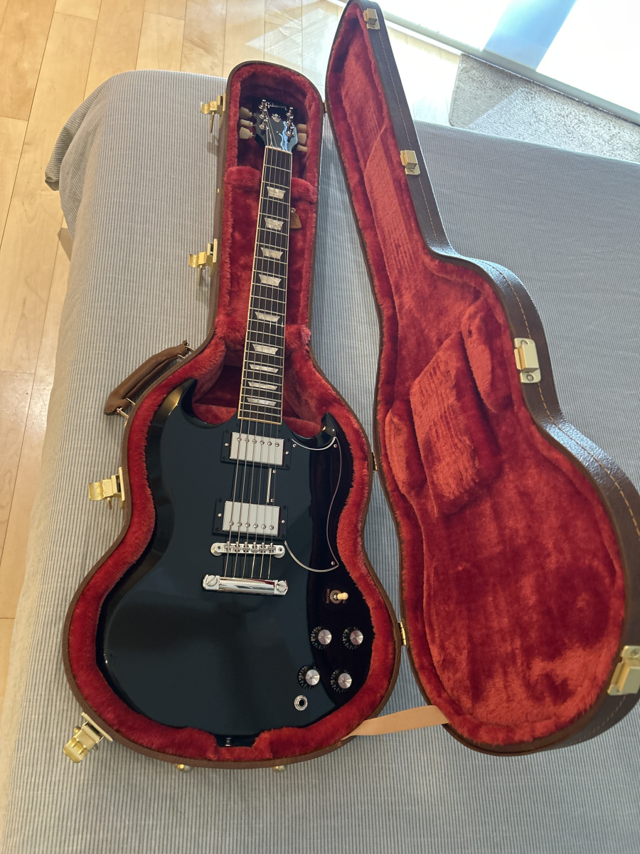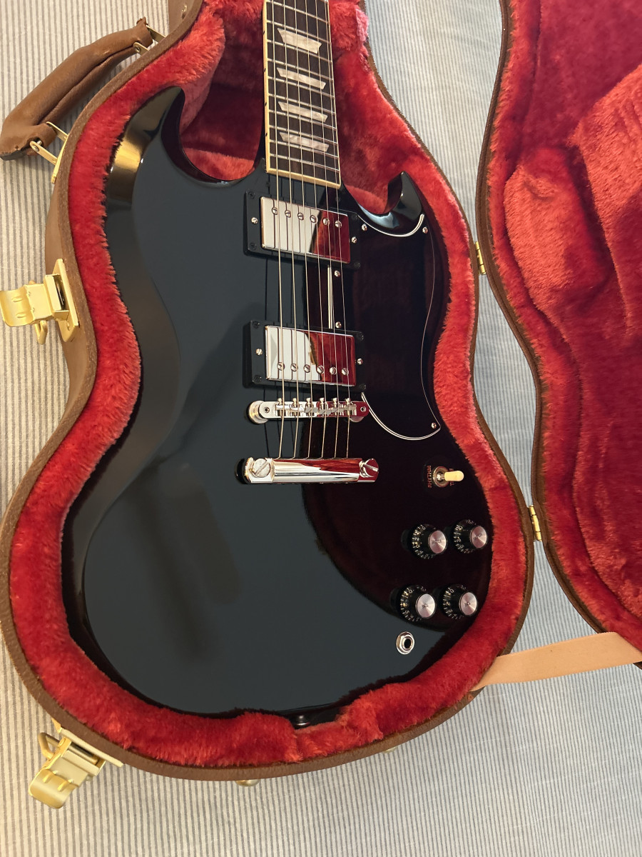 Gibson Sg 61 Ebony reedición de 2024. Solo se vendió en exclusiva a través de la web de Gibson, nunca en tiendas. Actualmente descatalogada y muy muy difícil de conseguir una. La mía está nueva a estrenar, ni un rasguño.