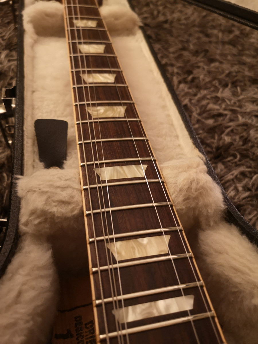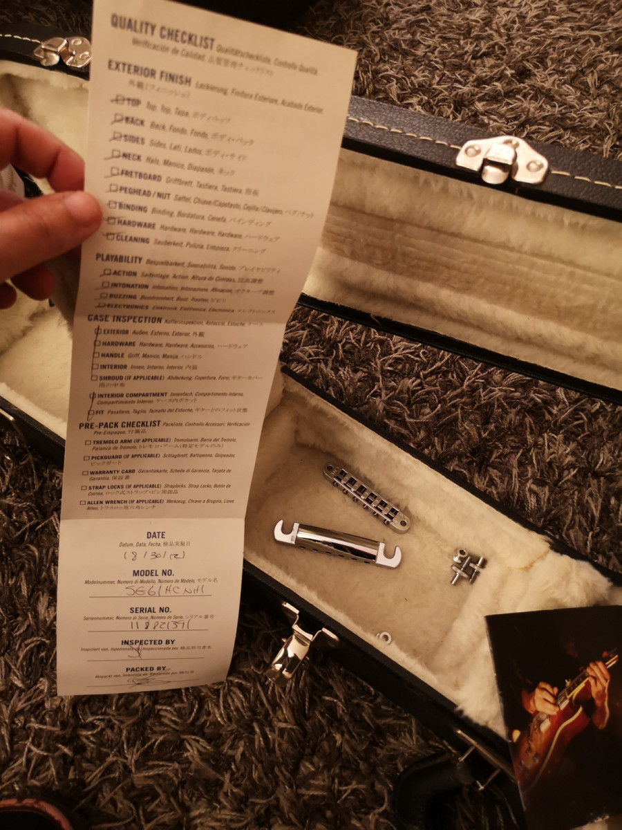 Toda original con su estuche y documentación, única modificación las pastillas, lleva unas Gibson Burstbucker II y III (mastil y puente) a mi gusto le van mejor al mueble que las classic 57, más salida y más cuerpo y un puente/cordal/postes Faber de aluminio que le pongo a la mayoría de mis guitarras (incluye el original Gibson) cuestan un dinero.