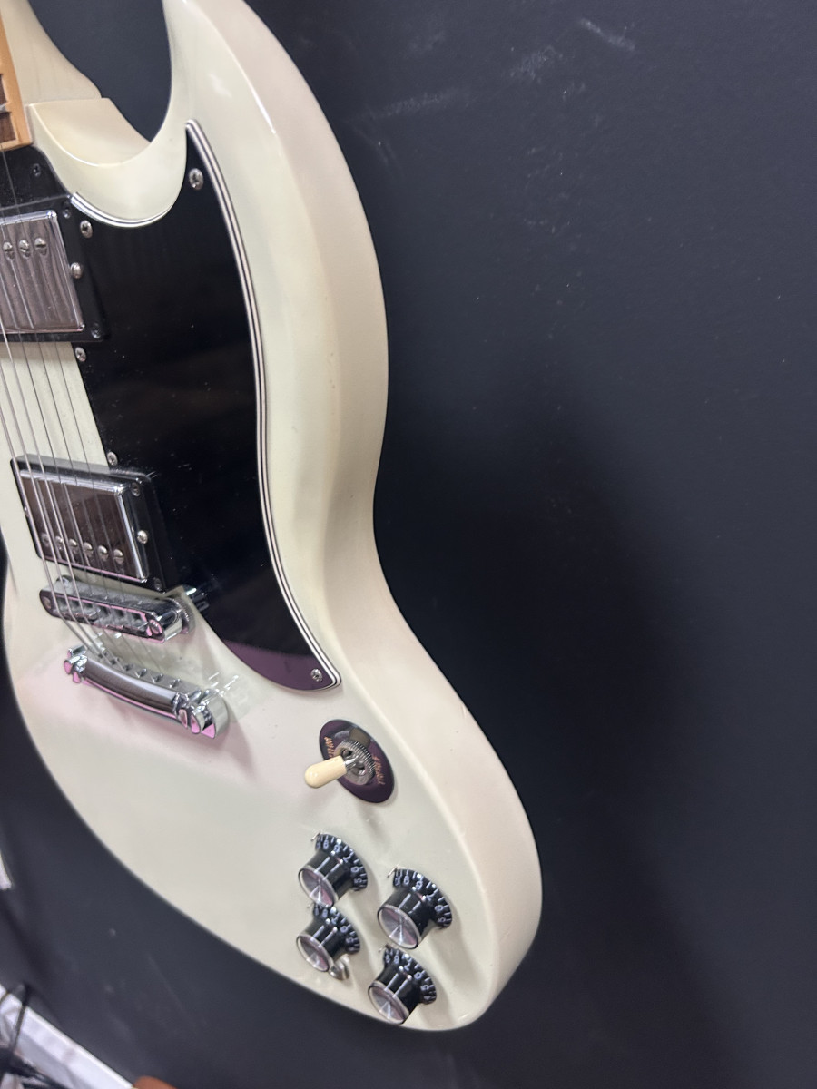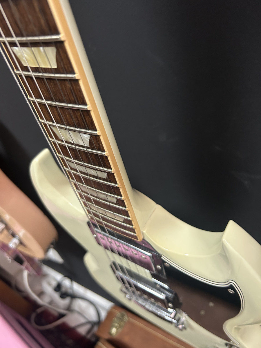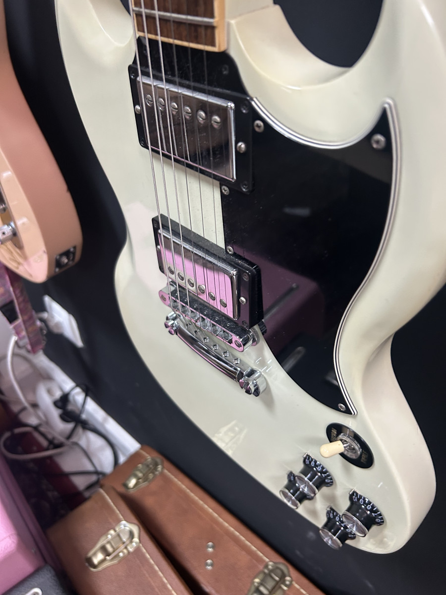Gibson sg 61 año 2012 Color blanco que con los años ha cogido un look increíble 😻 el craqulado es del tiempo aquí es relic real todo !!