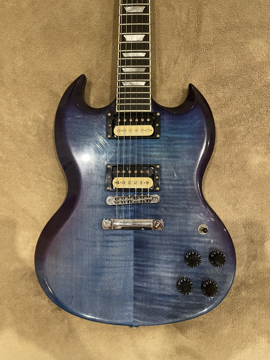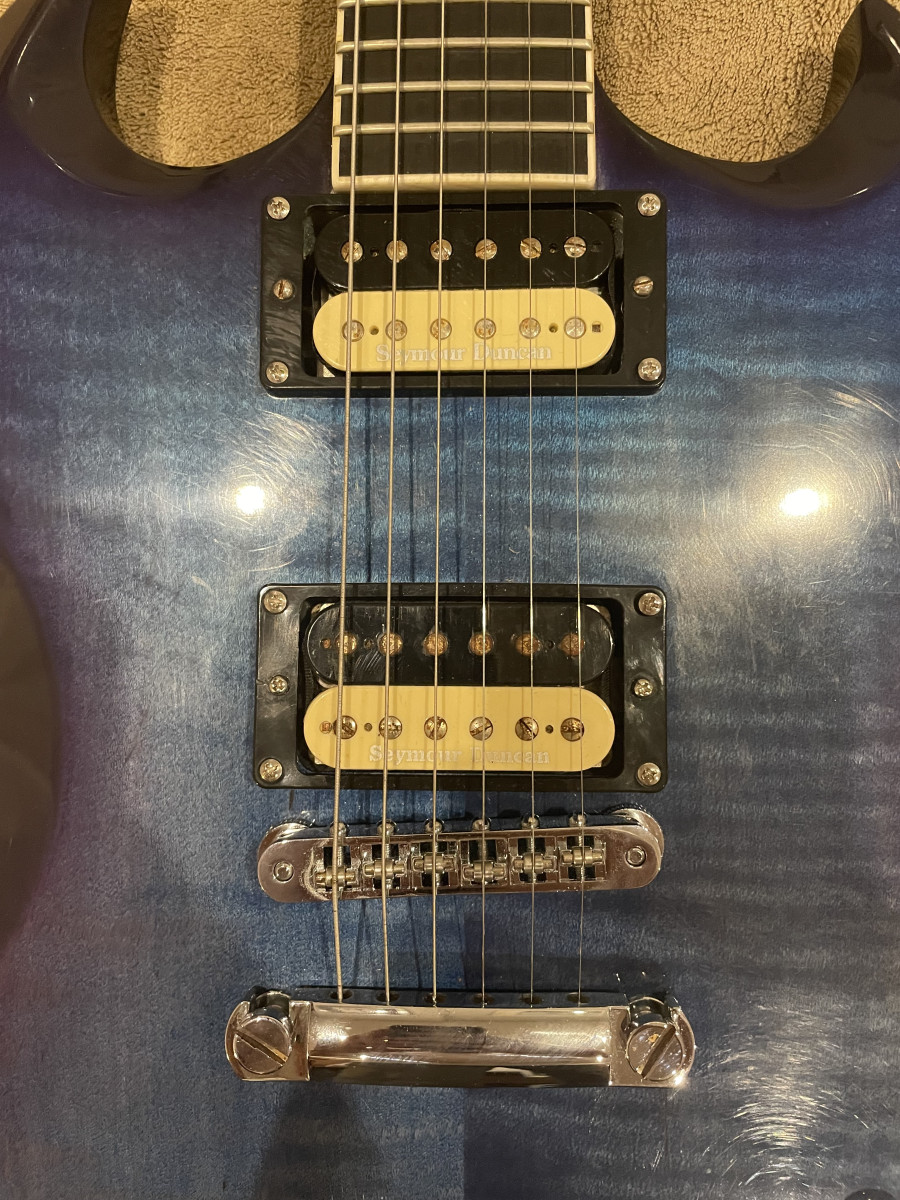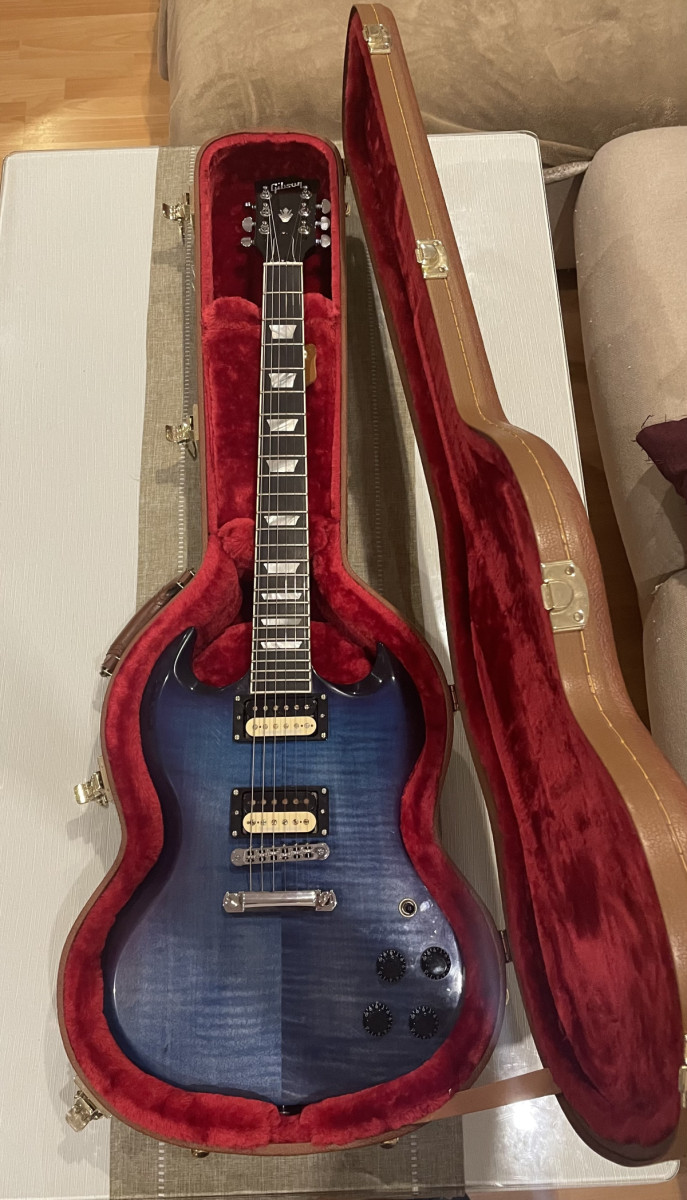Vendo Gibson SG Modern de 2021 en Blueberry Fade, una de las mejores apuestas de Gibson de ese año. Se trata de la gama más alta de las SG de serie, con la particularidad de tener una tapa de arce (típico de las Les Paul), lo que le da un cuerpo brutal. Las pastillas se cambiaron por unas Seymour Duncan Custom 5 (puente) y del 59’ (mástil) y el puente por uno con rollers. Tiene algunos dings de conciertos. Sonido pro. Incluye estuche, papeles y correa. Envío peninsular. CAMBIO POR GIBSON LES PAUL + COMPENSACIÓN ECONÓMICA.
