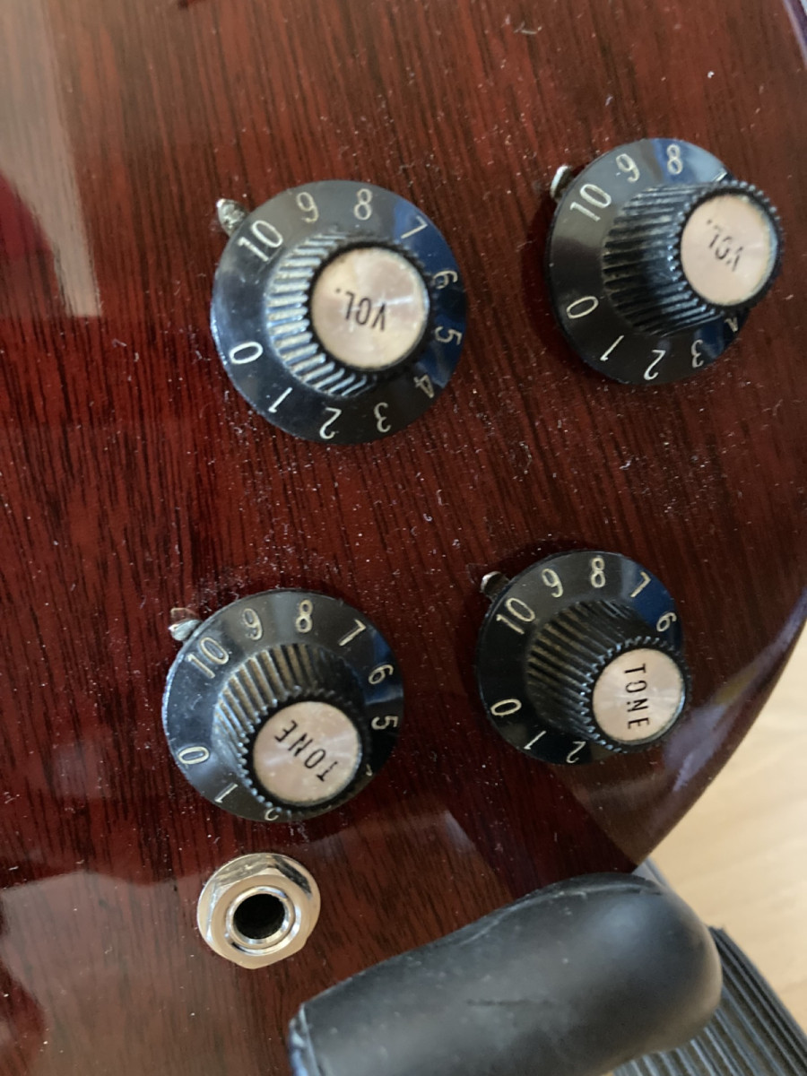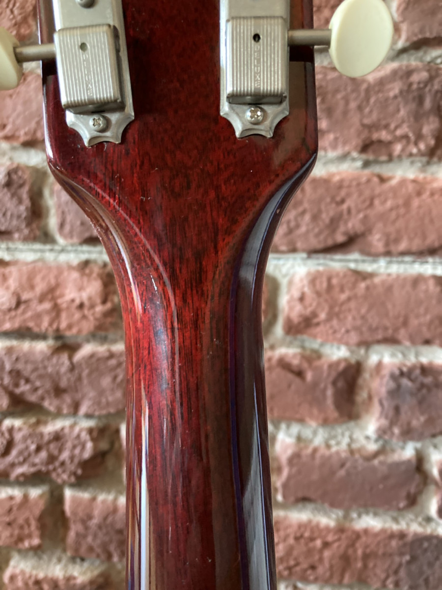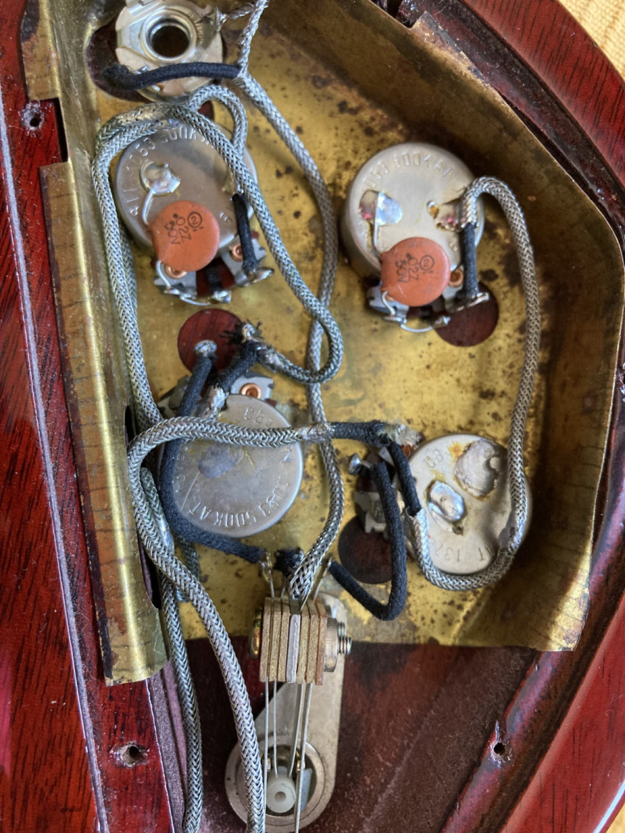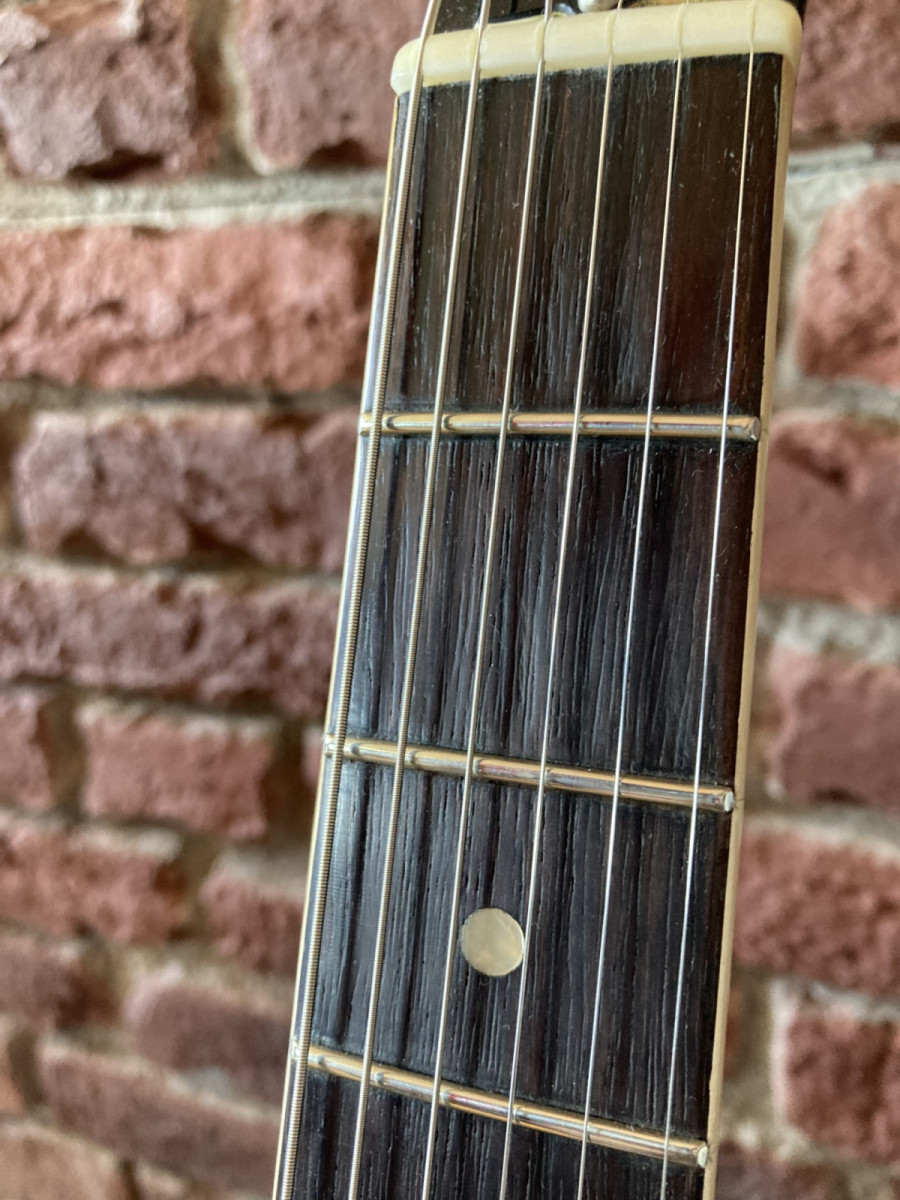 Al margen de estos materiales, se le han puesto reproducciones (vintage correct de alta calidad) de clavijeros, puente, palanca y golpeador, además de un retrasteo con trastes Jescar medium Jumbo (terminada la restauración en verano de 2025). La guitarra se encuentra en muy buen estado estético, a excepción de algún crackelado que muestro en las fotos. En su día, la guitarra se había modificado para tener humbuckers, por lo que hay una pequeña hendidura en el cuerpo para alojarla. Desconozco si el estuche es el original, pero cumple perfectamente su función.