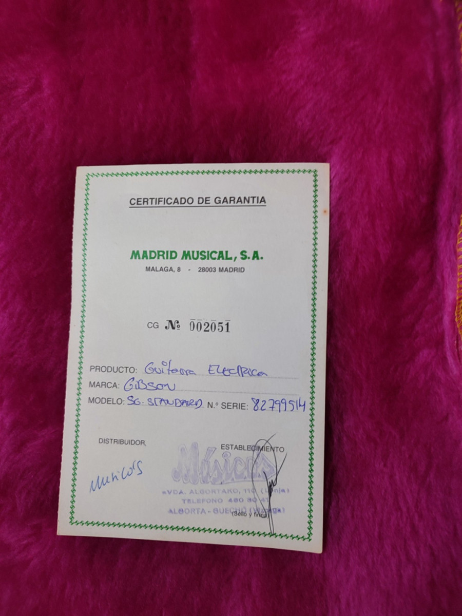Gibson SG Standard de 1989 en un estado impecable ya que solo la he usado contadas veces en un home studio, con su maleta Gibson y todo original, un cañón de guitarra. Comprada en Músicos Algorta.