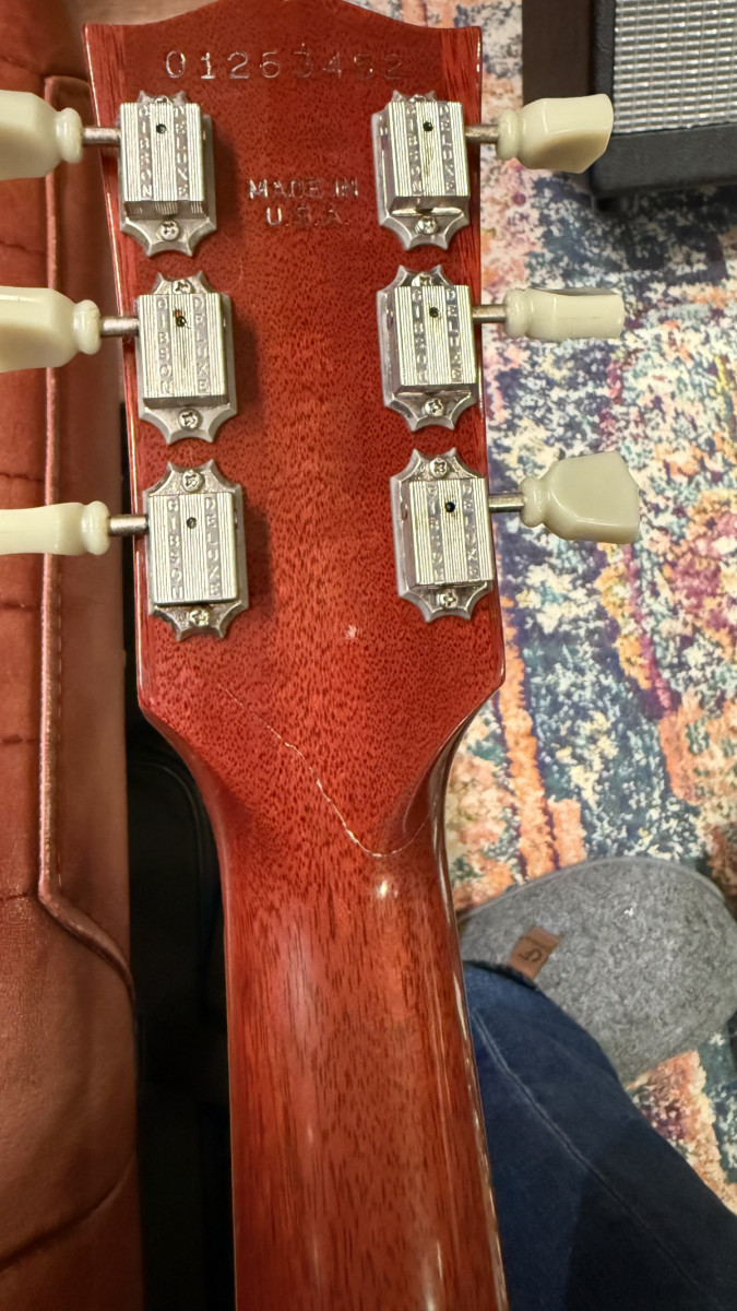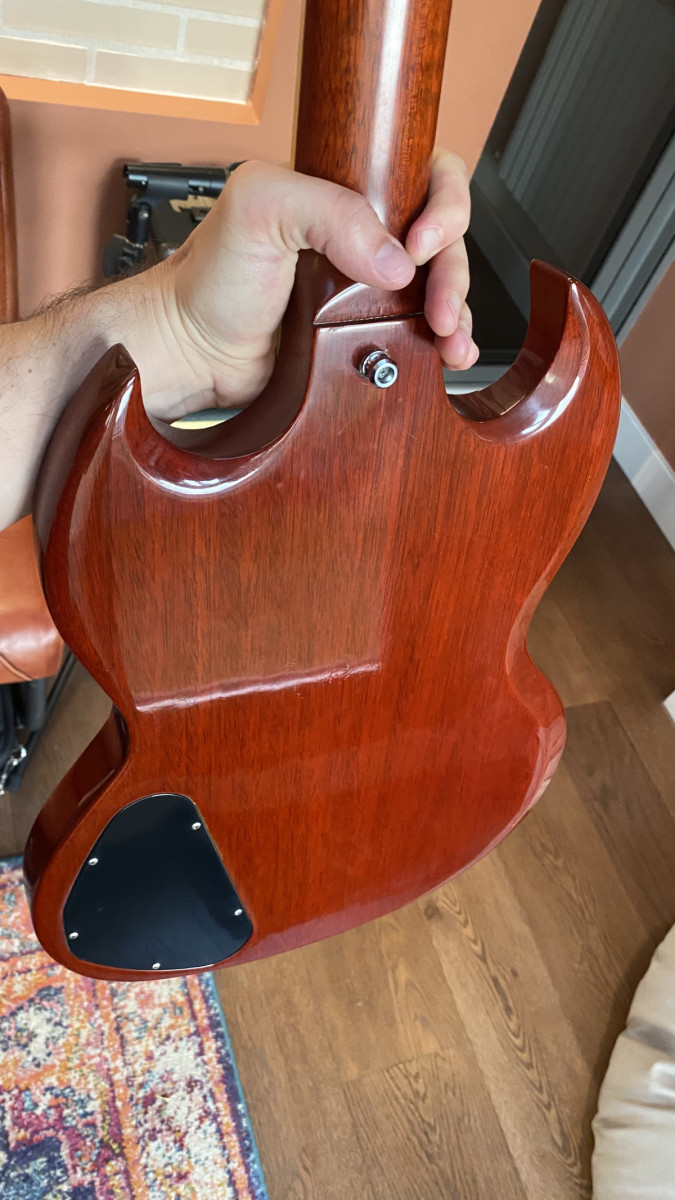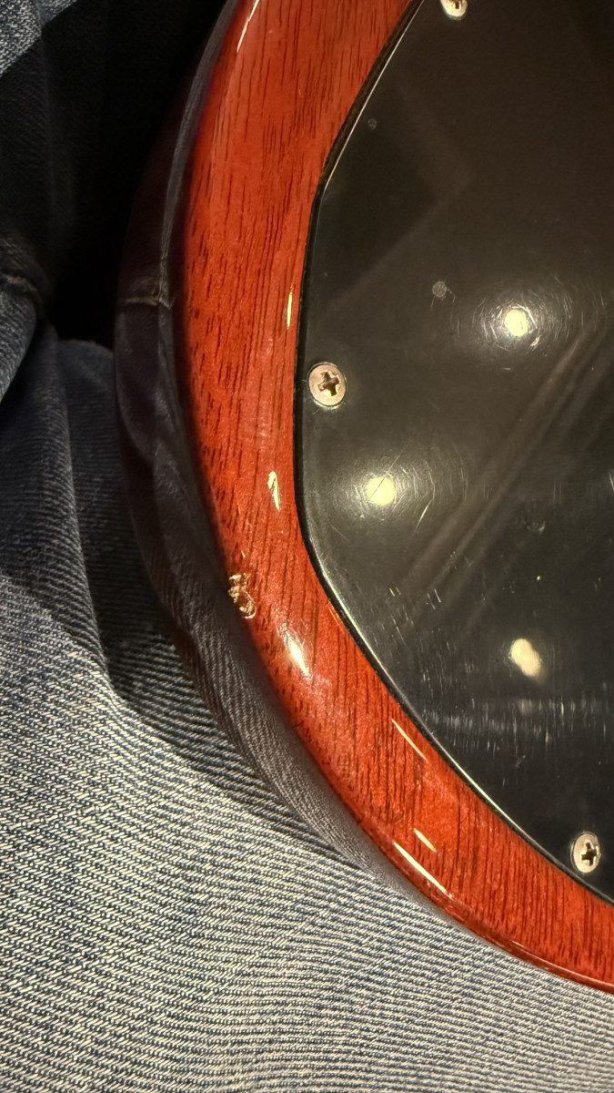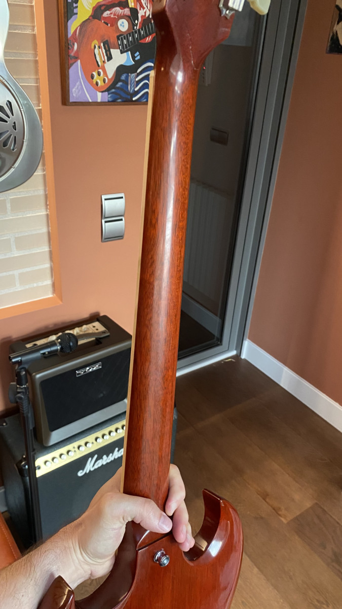 Vendo mi Gibson SG con pala reparada por luthier. La tuve a la venta hace unos días y el comprador finalmente se echó para atrás. La pala no llegó a romper del todo y la reparación fue muy sencilla. La reparación la hizo el luthier MiguelJem, compañero de guitarristas.info. Compré la guitarra así a otro forero, así que no sé cómo se hizo el daño exactamente.