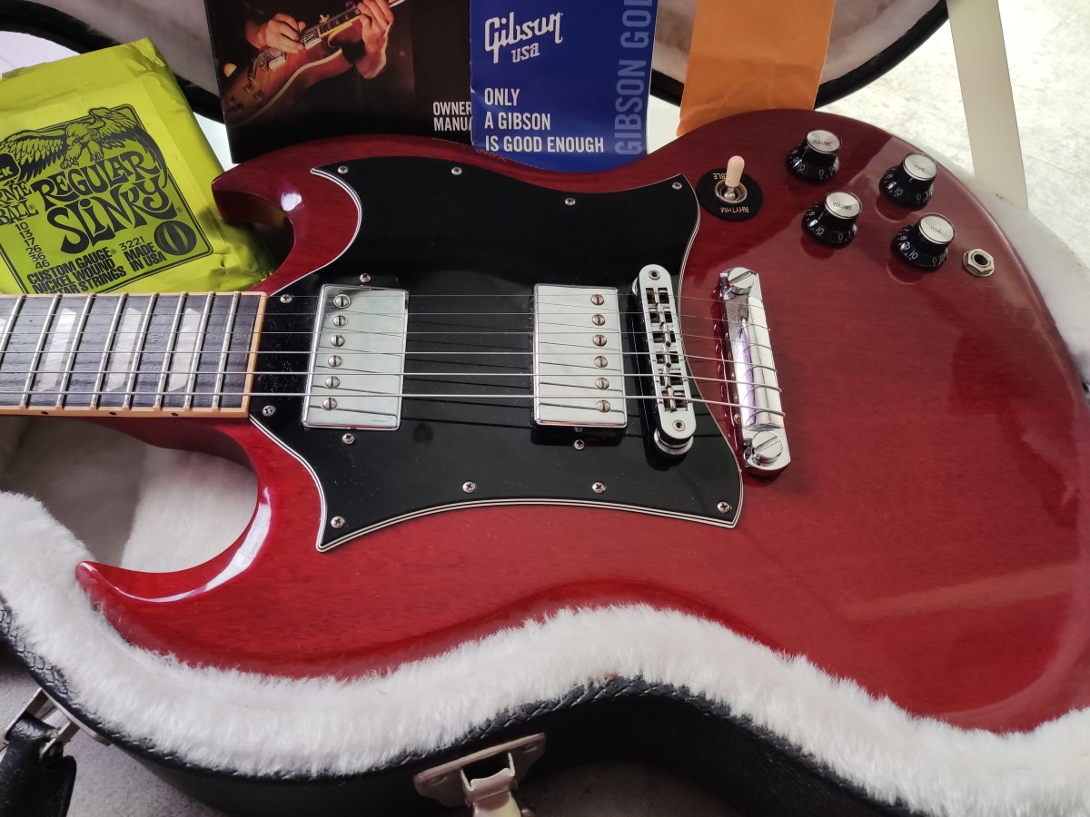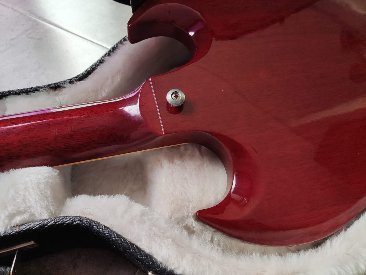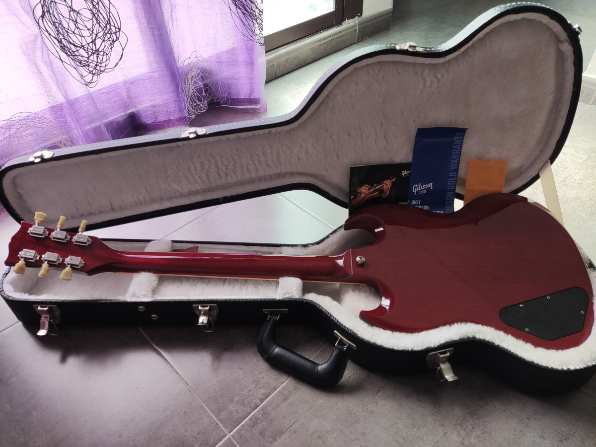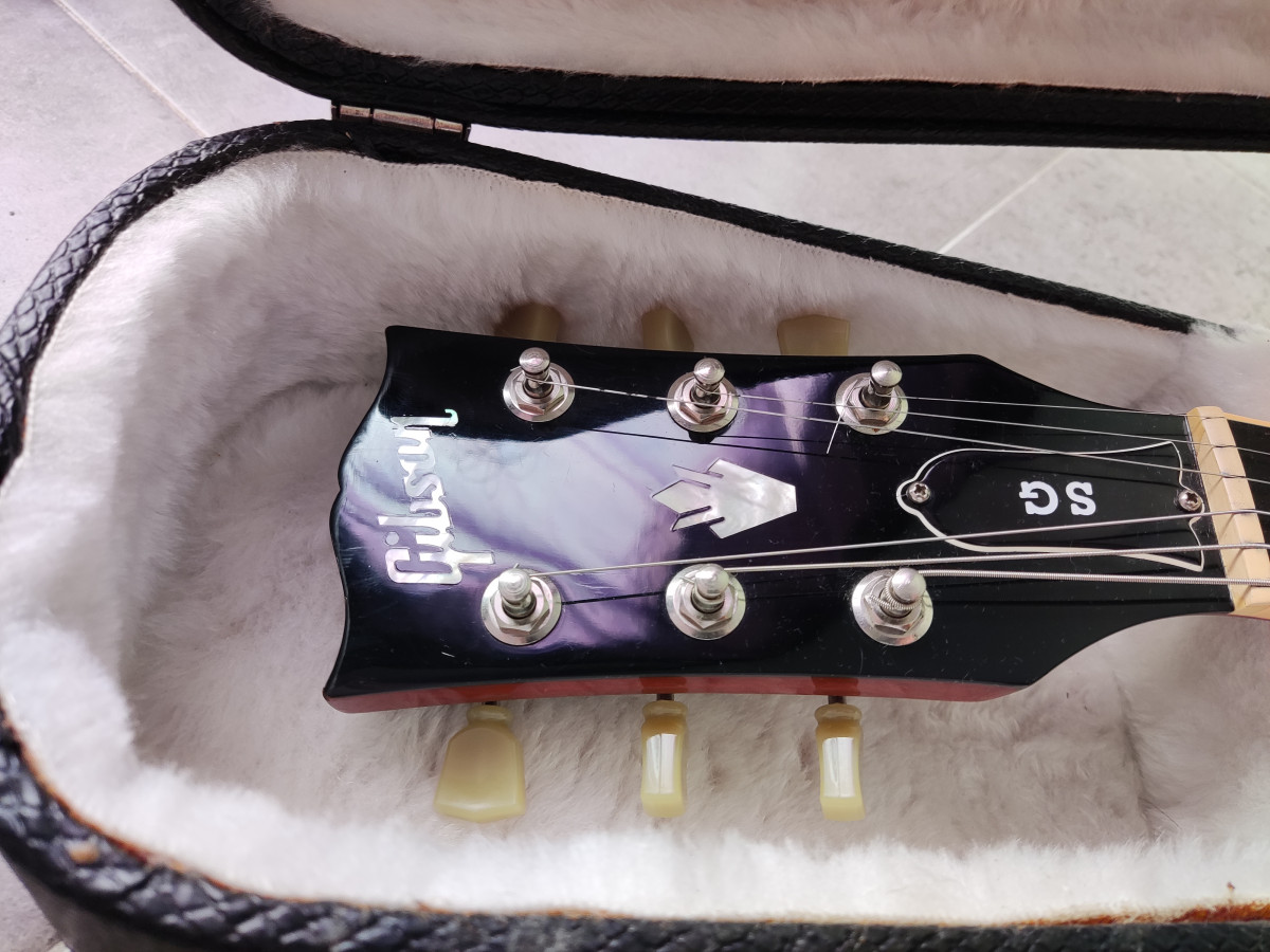 Hola buenas, no me voy a extender con las características porque creo que ya sabéis cómo es una SG standard tradicional de toda la vida. La compré hace poco y le he pulido y sacado brillo a los trastes, limpiado e hidratado el diapasón y la entrego con un juego de cuerdas nuevo Ernie Ball 10-46. También he limpiado y perfumado el estuche rígido. Tiene dos raspones en la parte de atrás del cuerpo, en el canto y algún ding, pero solo estético de la nitro y sin importancia, por supuesto no está de más decir que la pala está perfecta, sin golpes ni reparaciones. Es la segunda Standard que tengo y es prácticamente igual a la otra en cuanto a sonido/tono, la verdad que en las SG Standard parece que siempre son consistentes en calidad. Si lo que buscas es el tono del rock y blues es una apuesta segura y suena como esperas que suene una SG.