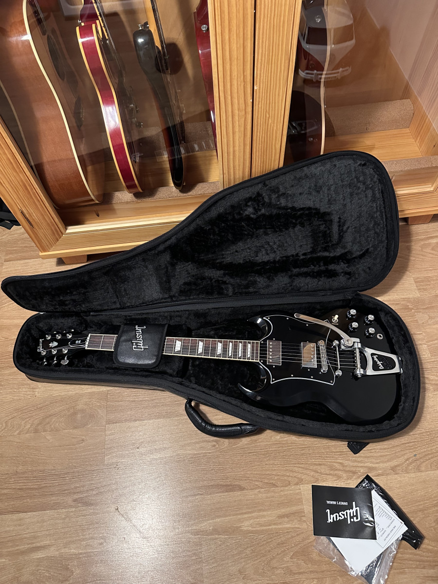 Gibson SG Standard del año 22, lleva como mejoras el Bigsby y clavijero Grover de bloqueo. Ambas mejoras suman un buen pico. Incluyo stop tail por si se quiere retirar el Bigsby. La guitarra está impoluta y suena tremenda con mucho sustain gracias al Bigsby. Estas últimas SG incluye el premium software case en vez del clásico estuche.