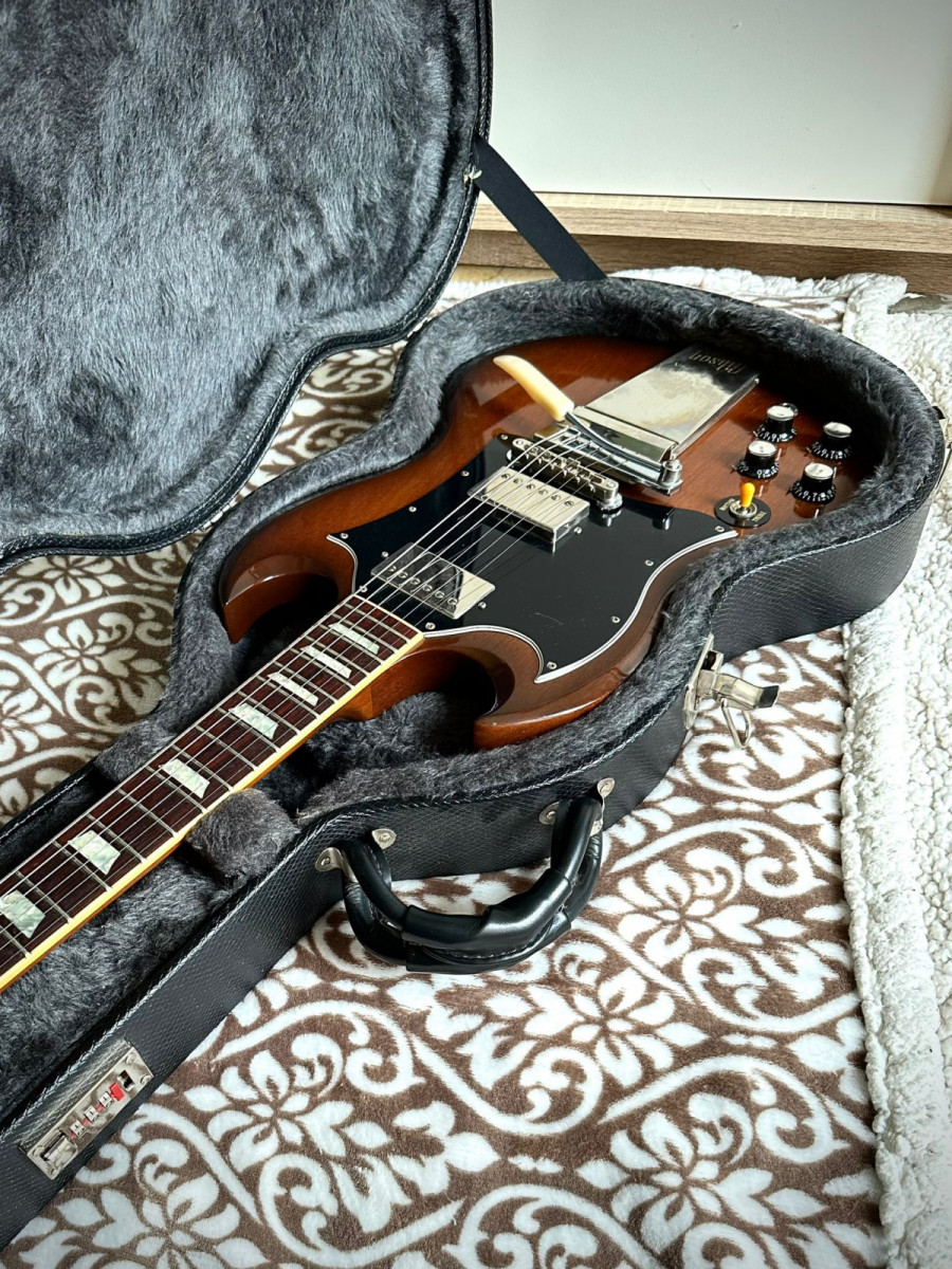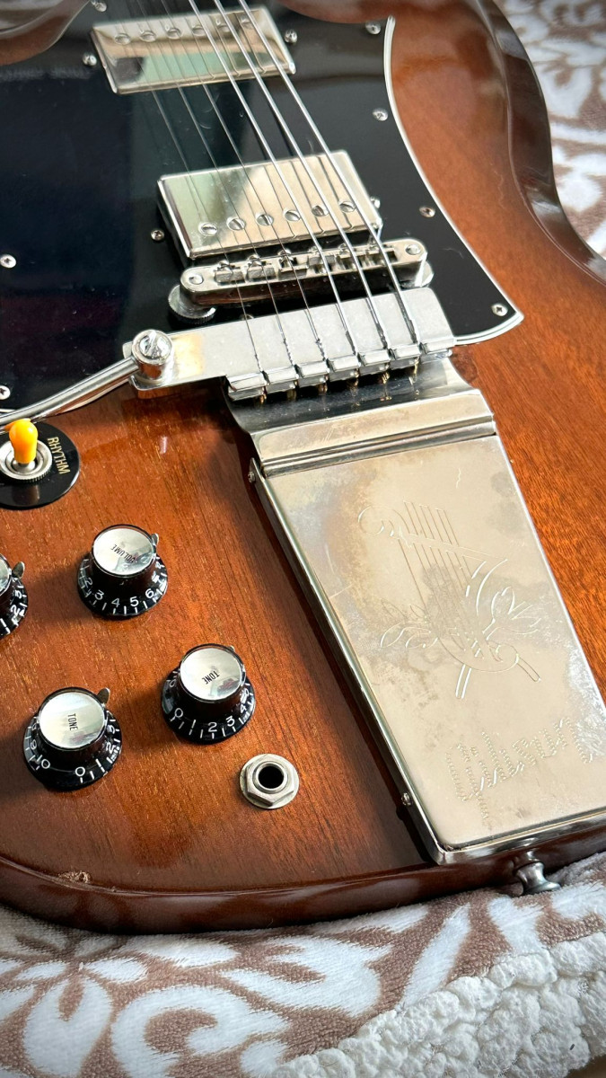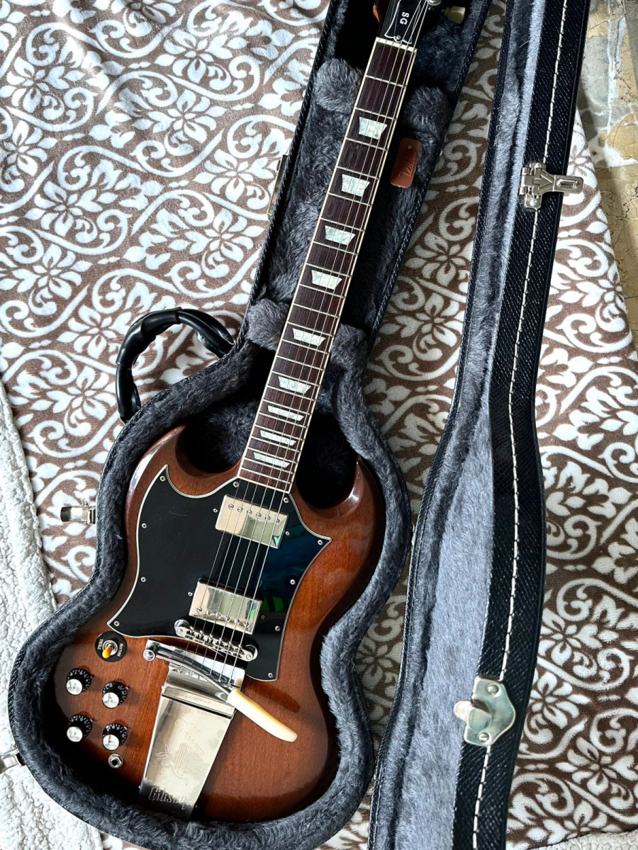 OFERTA POR TIEMPO LIMITADO (me interesa otro articulo en venta) Vendo Gibson SG Standard Modified con Vibrola Maestro Gibson, Natural burst, tanto el color como la vibrola, una rareza en este mundo de los zurdos. Incluye estuche. Escucho ofertas o cambio por tipo 335 o semihollow si la distancia lo permite, cambio solo en mano.
