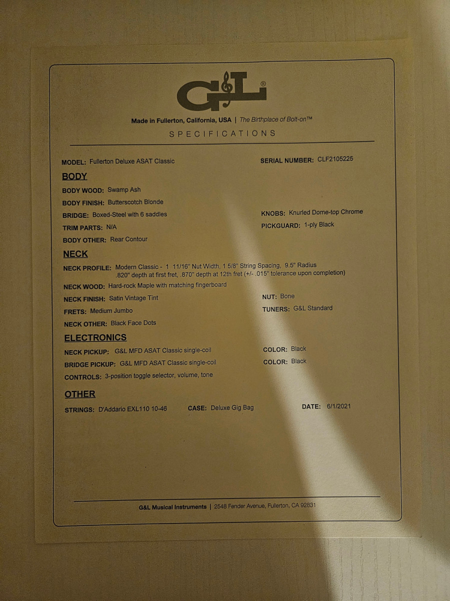 Cambio G&L asat (modelo tipo telecaster) fullerton made in usa en color butterscotch blonde y con cuerpo de swamp ash. Comprada nueva hace año y medio en tienda, aunque fabricada en 2021. Está impecable. No ha salido de casa. Lleva estuche blando G&L, ya que desde el covid la marca no usa hardcase. Aunque podría entregarla con un estuche duro genérico. Tiene certificados de autenticidad y toda la documentación.