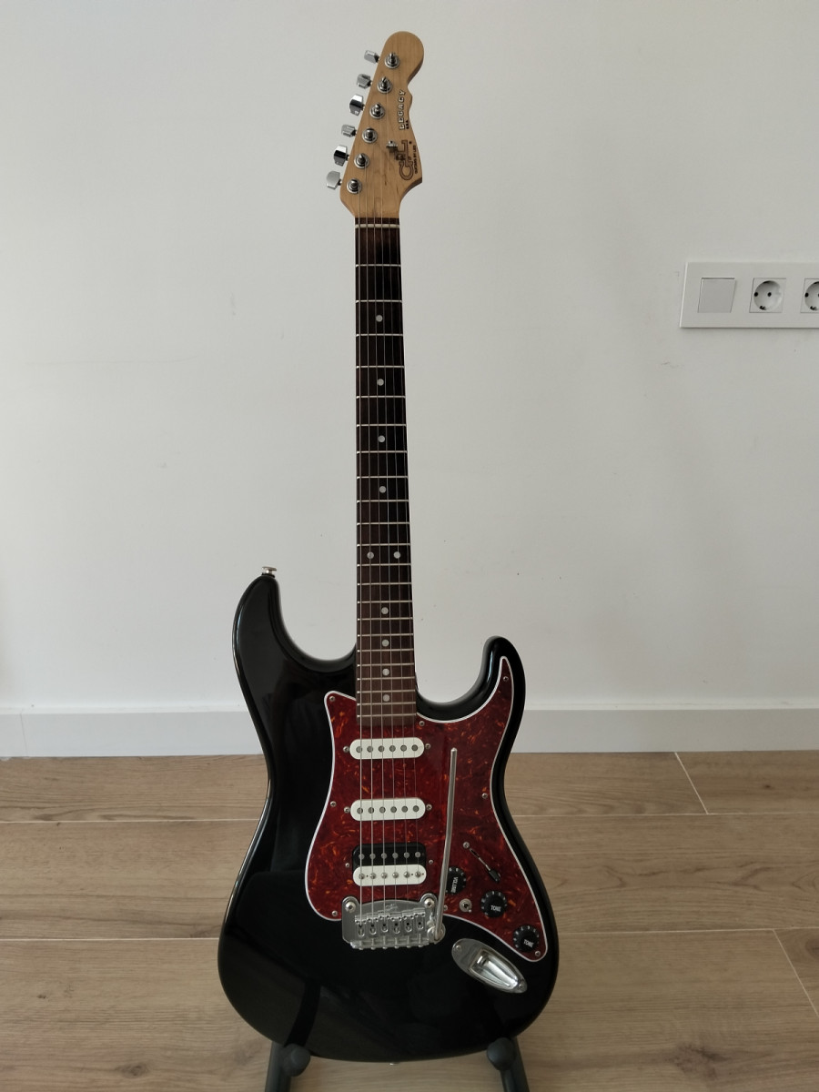 G&L Legacy hecha en Fullerton, Estados Unidos. Es una Stratocaster de excelente calidad, ideal para los amantes del sonido clásico Strato, pero con el añadido del humbucker en el puento para sonidos más rockeros. Este puede convertirse en single con la palanca.