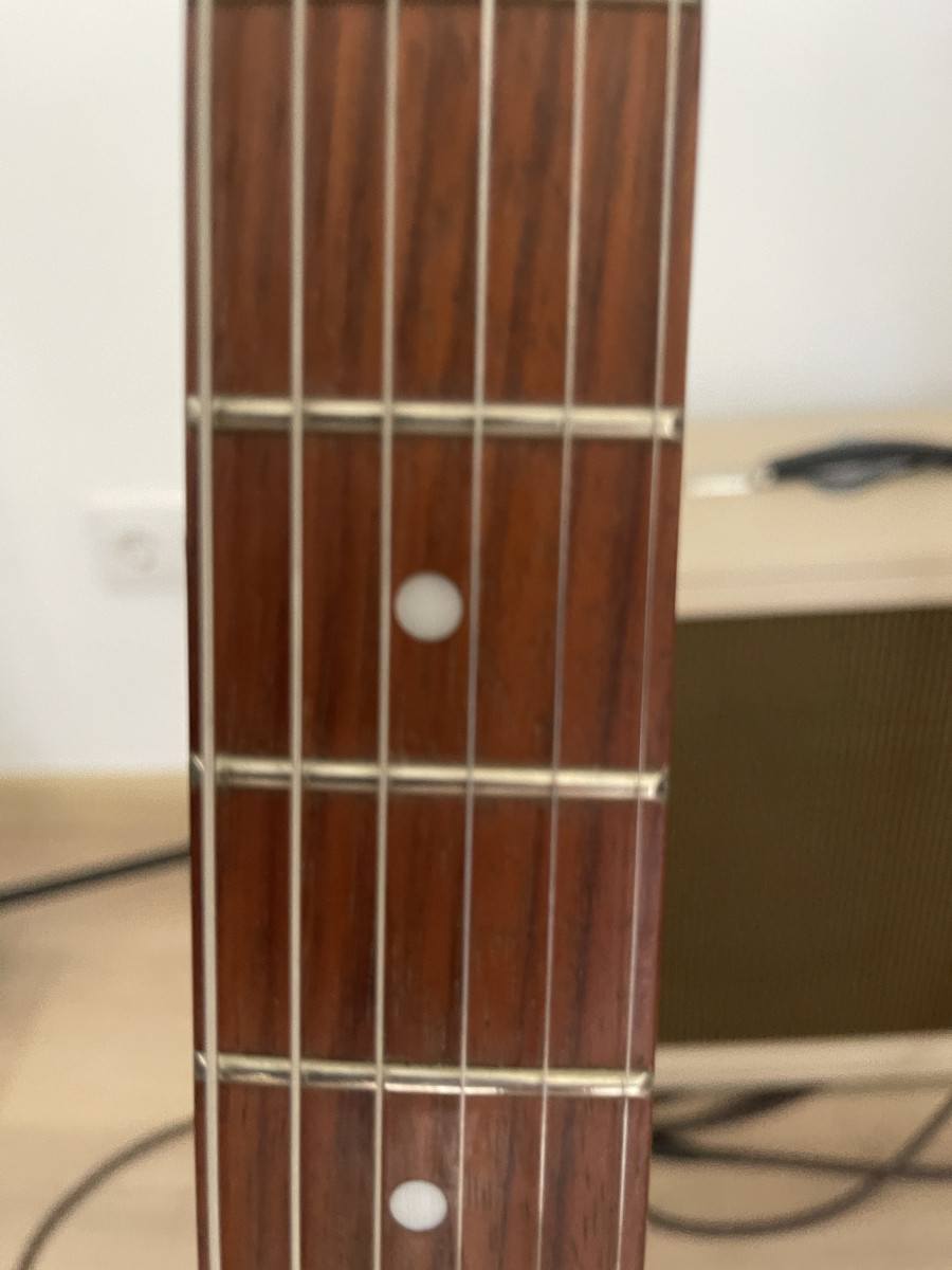Recien repasado por Herrera Guitars de Barcelona y está como nueva. Tiene taco de madera (extraíble) en el puente.