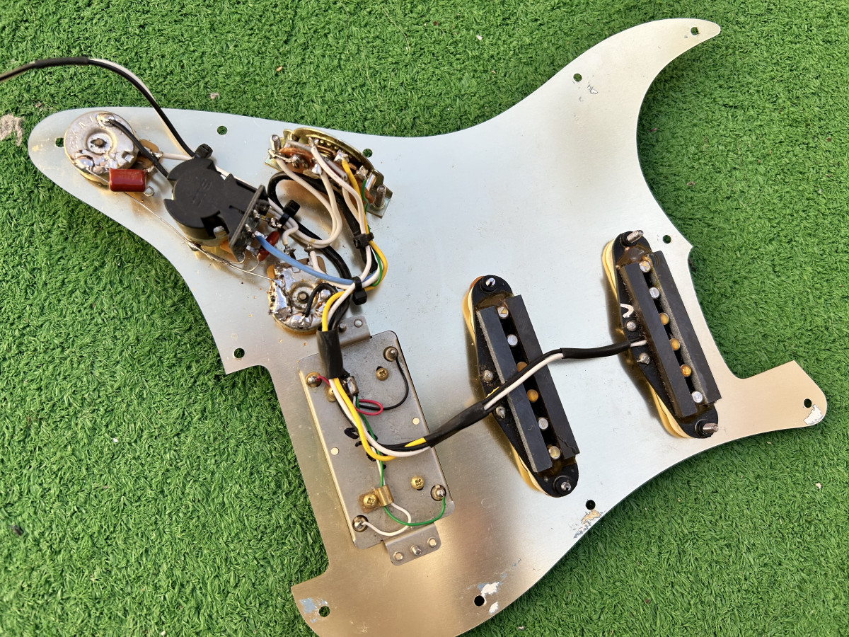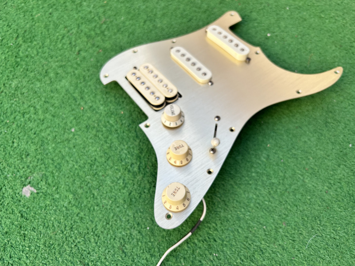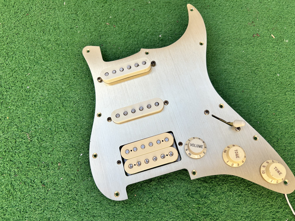 Golpeador stratocaster, formato HSS. Con pastilla humbucker Fender y pastillas single, creo que también son Fender. Con golpeador dorado anodizado, selector de 5 posiciones, sistema push-pull. Pickguard montado por luthier. Puedo añadir otro golpeador anodizado negro por 15€ más, o el crema por 8€ más.