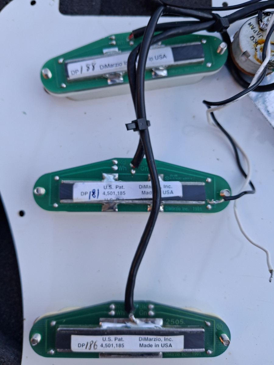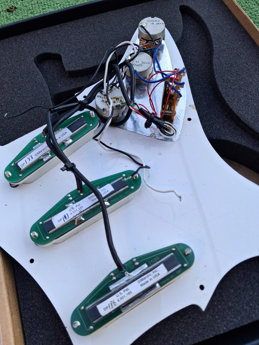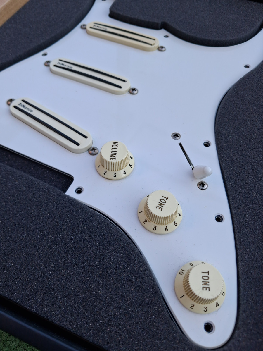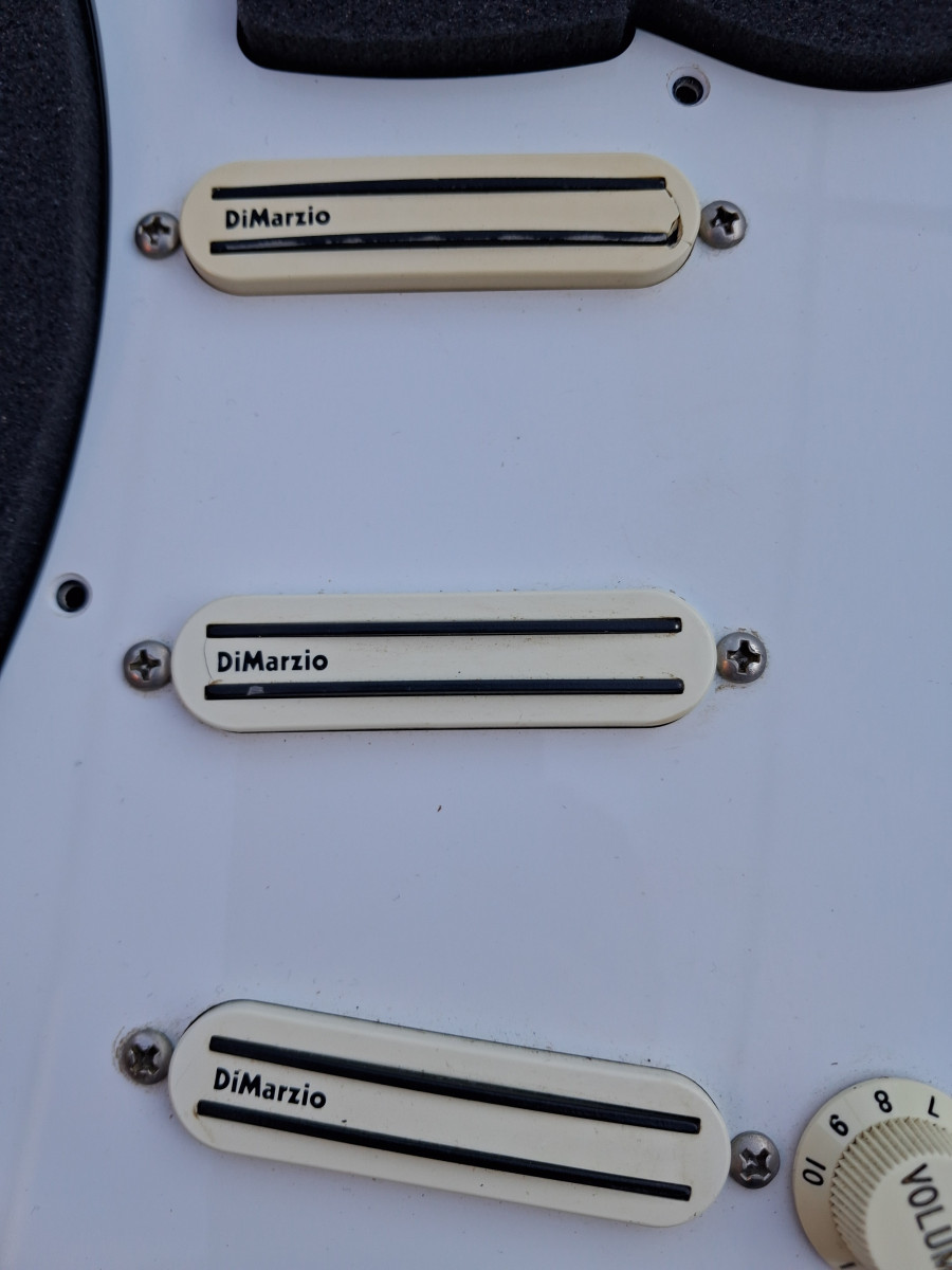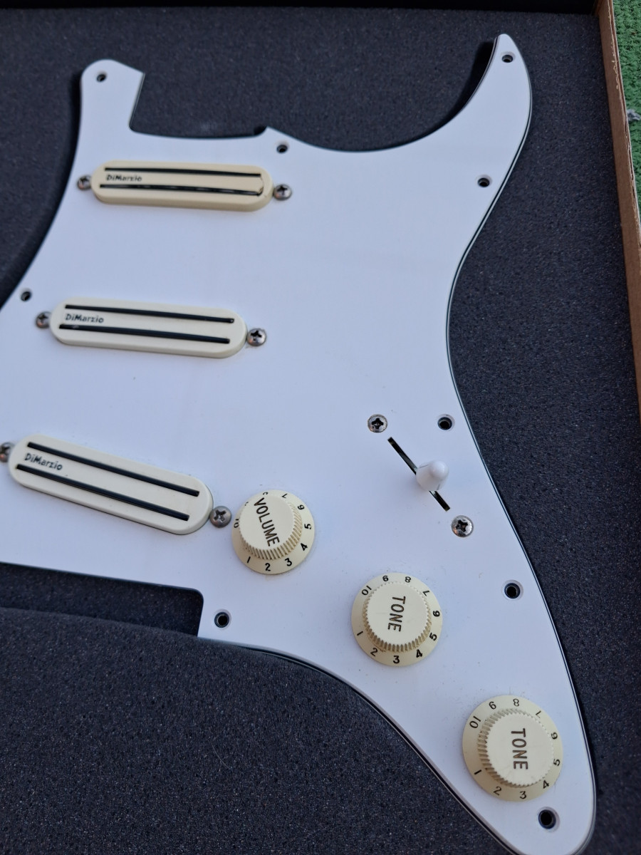 Se vende golpeador completo Stratocaster SSS, color blanco, con pastillas DiMarzio. Está en perfecto estado.