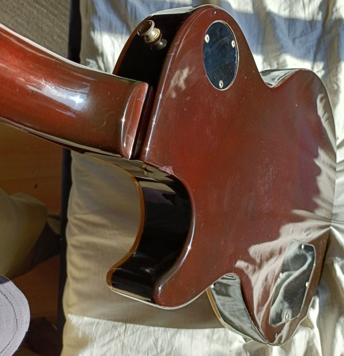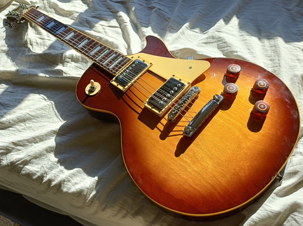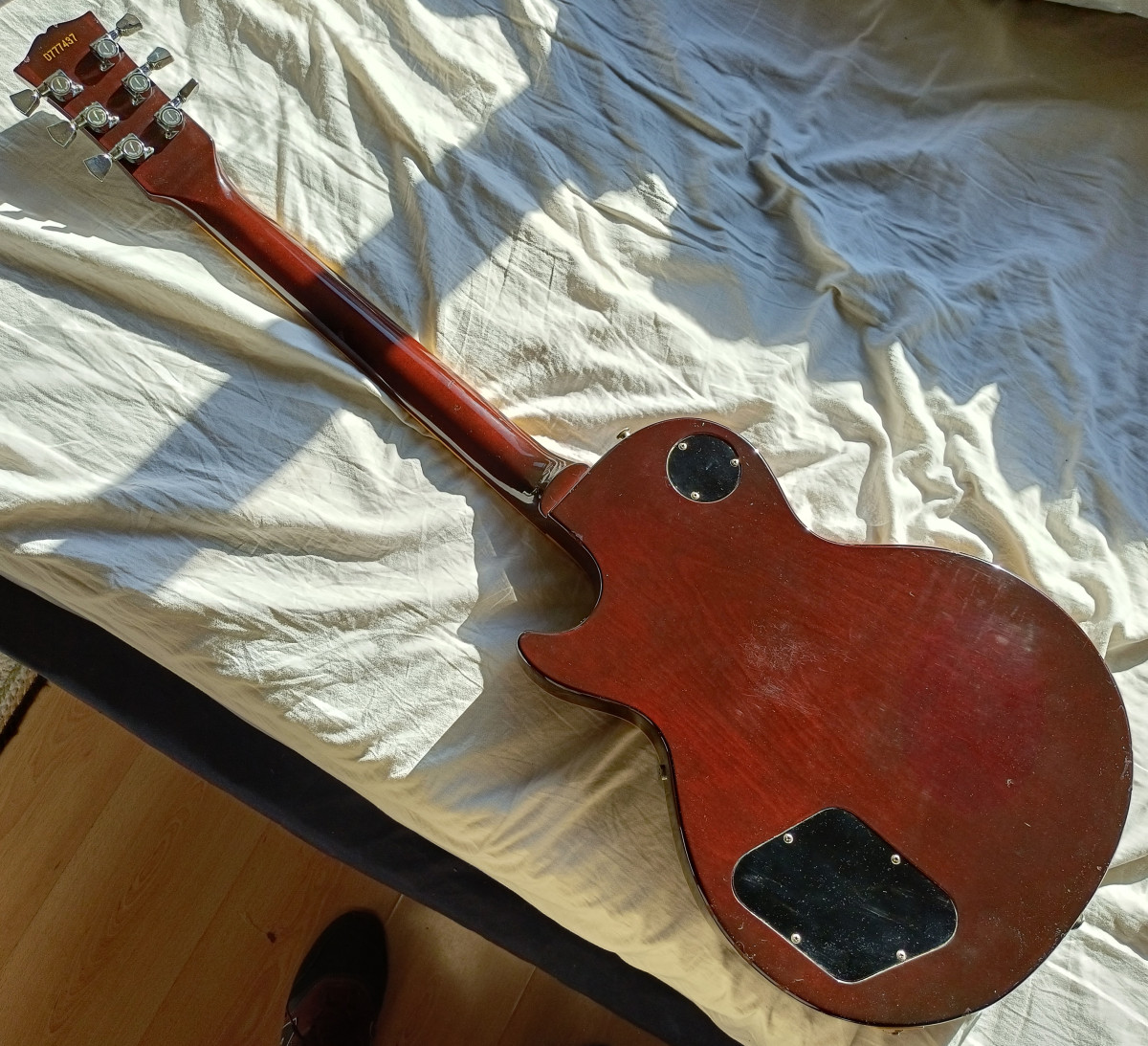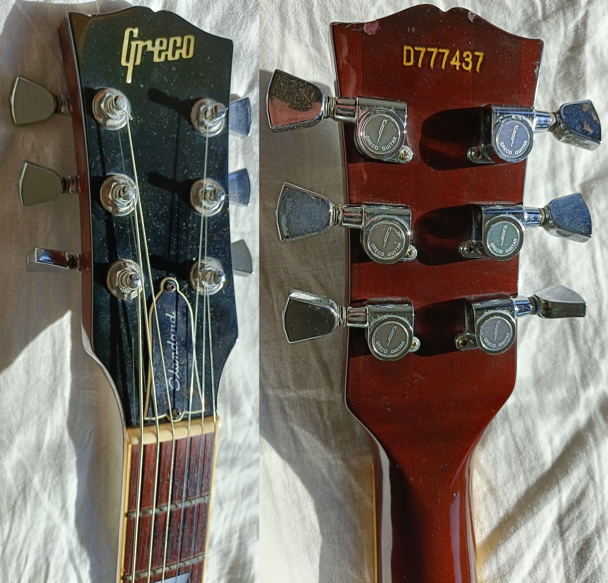 Guitarra eléctrica Greco Les Paul Standard de 1977 en buen estado. Electrónica recién cambiada por luthier. Funciona perfectamente. Color tobacco sunburst. Casi al 100% que es el modelo EG700. Todo original salvo la electrónica de potenciómetros. Pastillas originales con números estampados en negro. Top plano no flameado. Binding en cuerpo y mástil. Afinadores tipo grover Gotoh con logo de la G. Trastes bastante bien, sin apenas planos. Toques de saltos de barniz en laterales y pala. Mastil de caoba. Al año siguiente hicieron las super real. Muy buena guitarra.