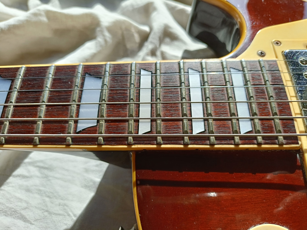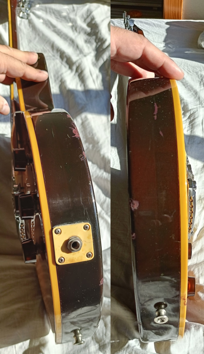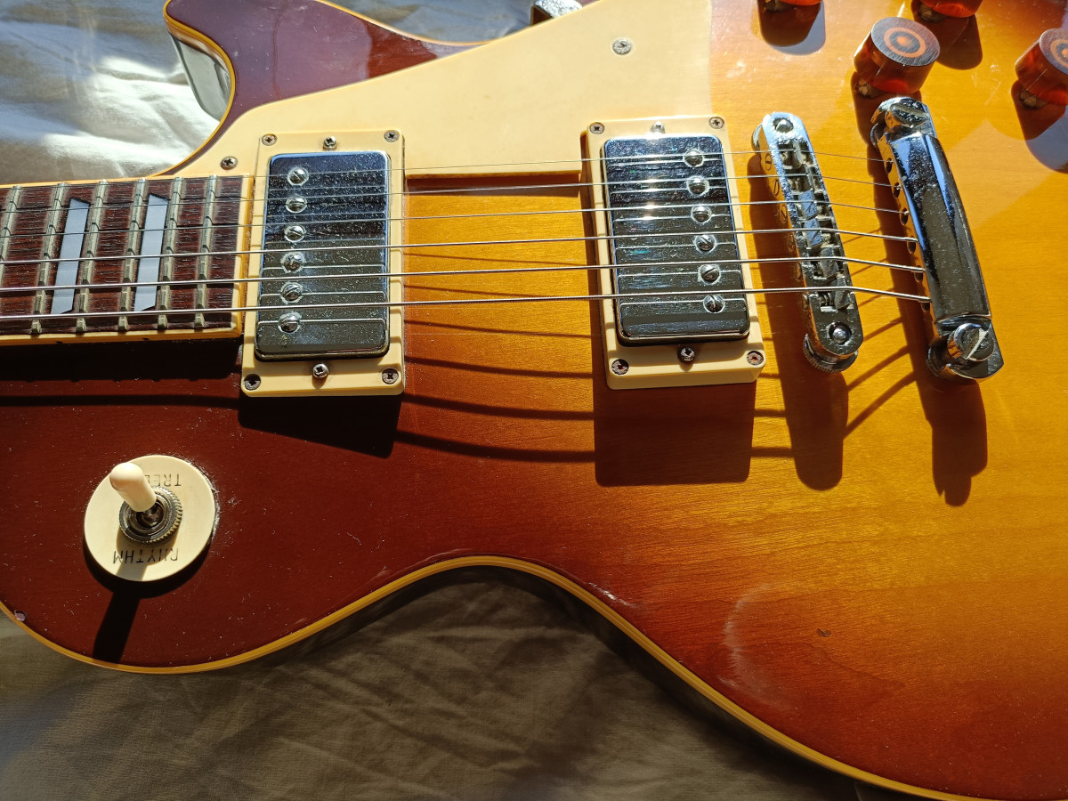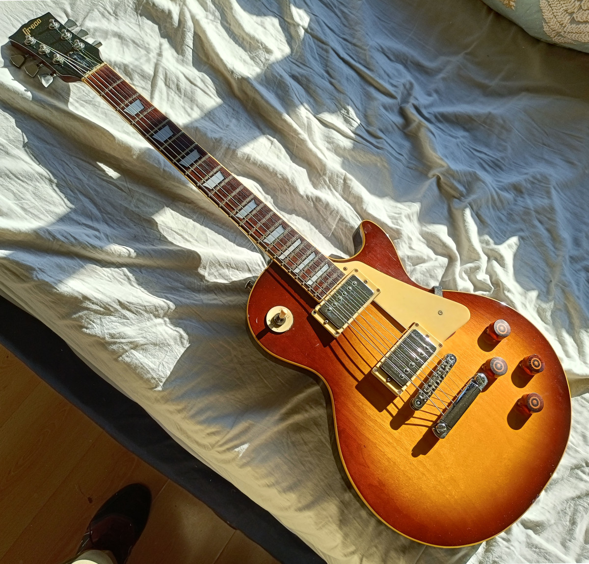 Guitarra eléctrica Greco Les Paul Standard de 1977 en buen estado. Electrónica recién cambiada por luthier. Funciona perfectamente. Color tobacco sunburst. Casi al 100% que es el modelo EG700. Todo original salvo la electrónica de potenciómetros. Pastillas originales con números estampados en negro. Top plano no flameado. Binding en cuerpo y mástil. Afinadores tipo grover Gotoh con logo de la G. Trastes bastante bien, sin apenas planos. Toques de saltos de barniz en laterales y pala. Mastil de caoba. Al año siguiente hicieron las super real. Muy buena guitarra.