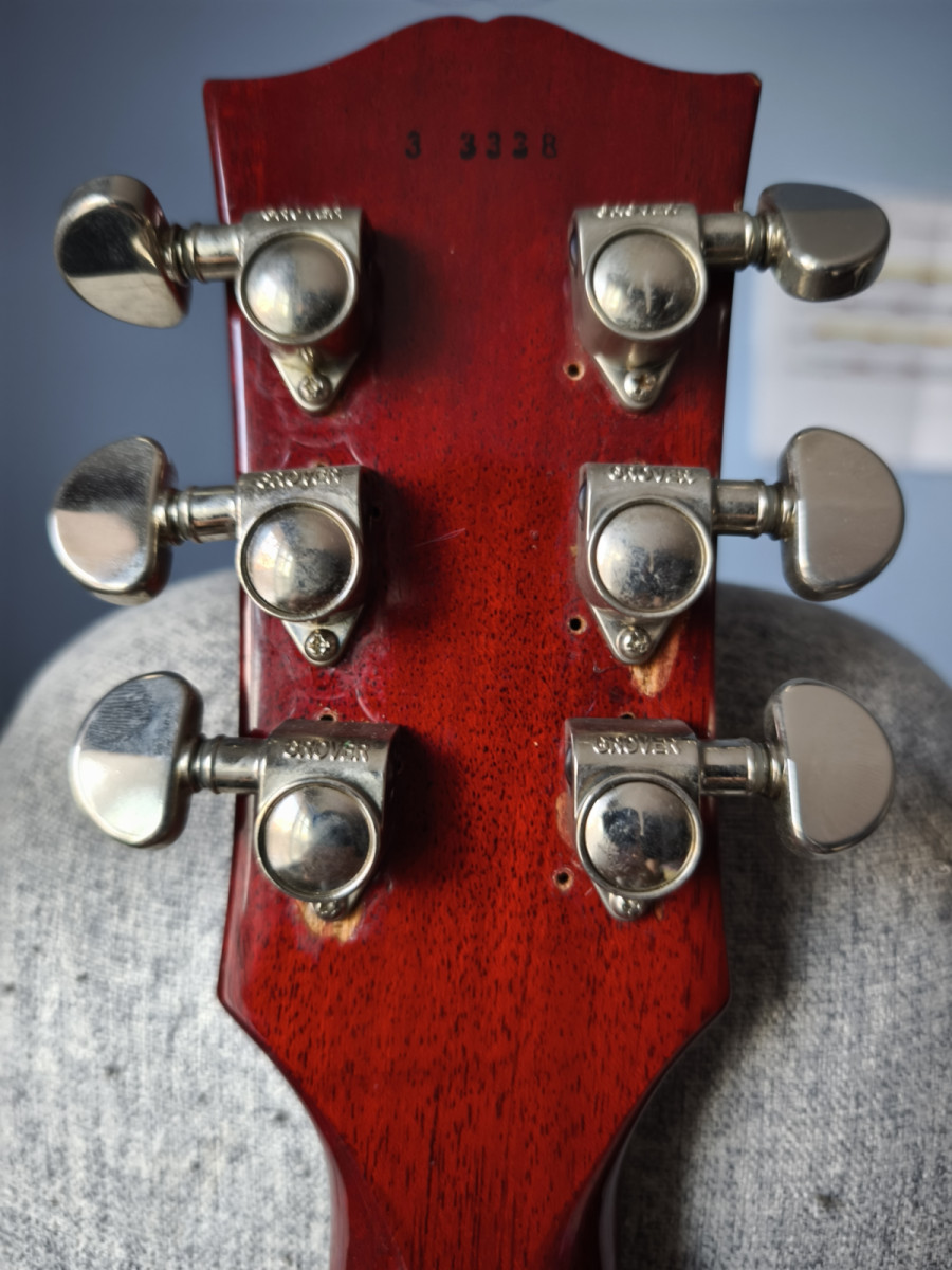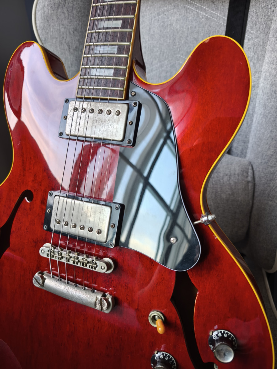 Cambio Greco "Super Real" ES 335 SA 64-60 de 1983, toda original menos el golpeador, los afinadores grover (mucho mejores que los originales) y el imán de las pastillas, que se cambiaron por AlNiCo III y suena infinitamente mejor y mucho mas vintage.