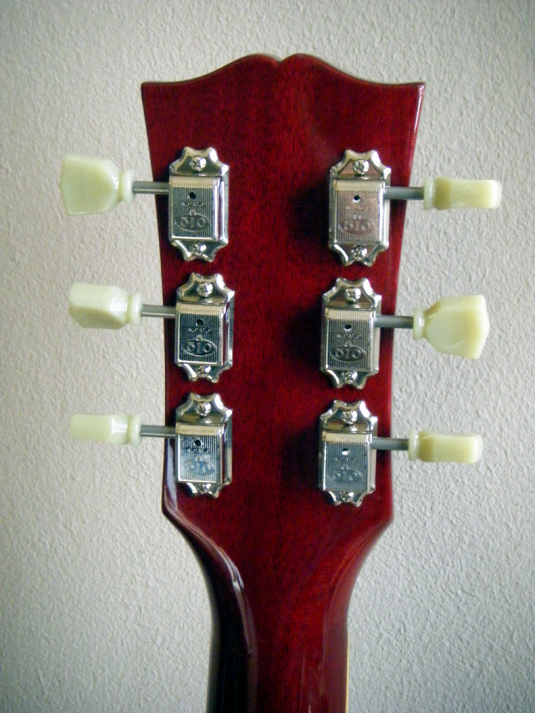- Clavijeros Gotoh SD-510 idénticos a los Kluson tipo "vintage tulip", ligeros y por tanto favorecedores de la resonancia, con una particularidad imprescindible si uno busca "correción histórica": los postes son de latón como en los Kluson de los 50 (sonido más cálido / equilibrado que con los postes de acero empleados en el 99% de los clavijeros actuales). La afinación con todos los clavijeros de esa marca japonesa es impecable: precisa y estable, como debe ser (fueron y todavía son proveedores de la mayor parte de los fabricantes japoneses).