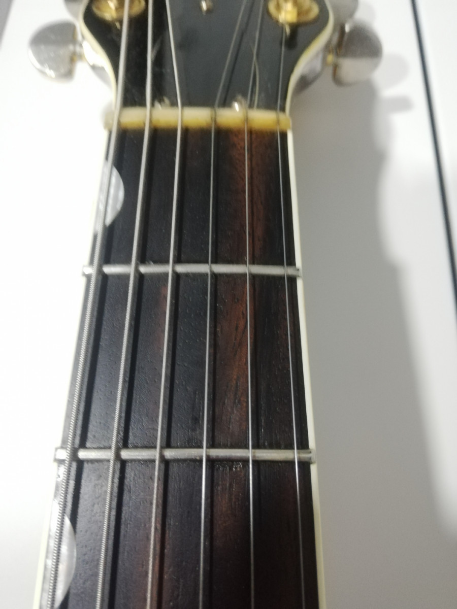 Presenta signos normales de uso: desgaste en el dorado, algún ligero roce...pero la verdad que está en muy buen estado, totalmente funcional, trastes con mucha vida y NINGUNA ROTURA. no conservo el pickguard original.
