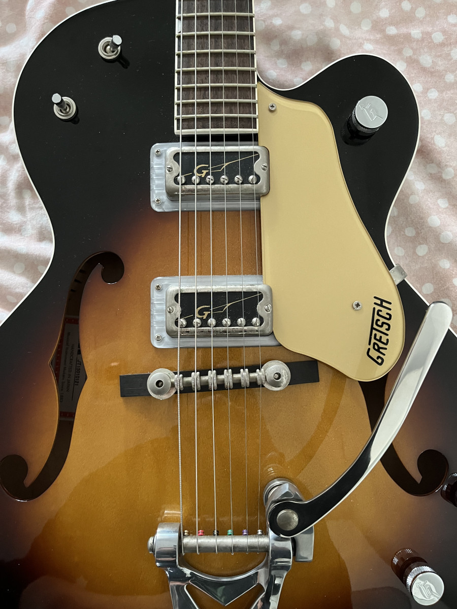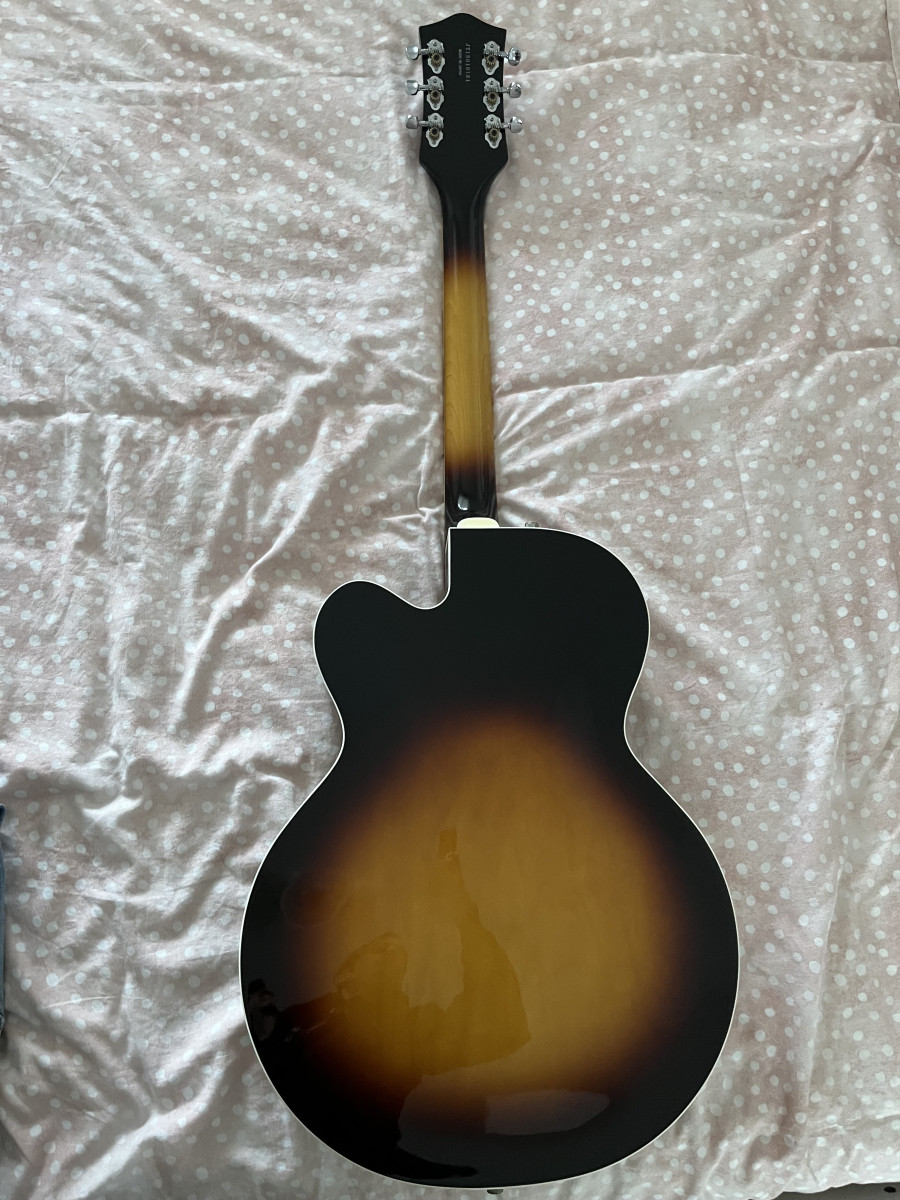 Gretsch Double Anniversary Japan en perfecto estado. Pastillas Hilotron, documentación de la guitarra año 2016. Sonido country, blues, rockabilly… se ve espectacular, funda rígida, acabado sunburst.
