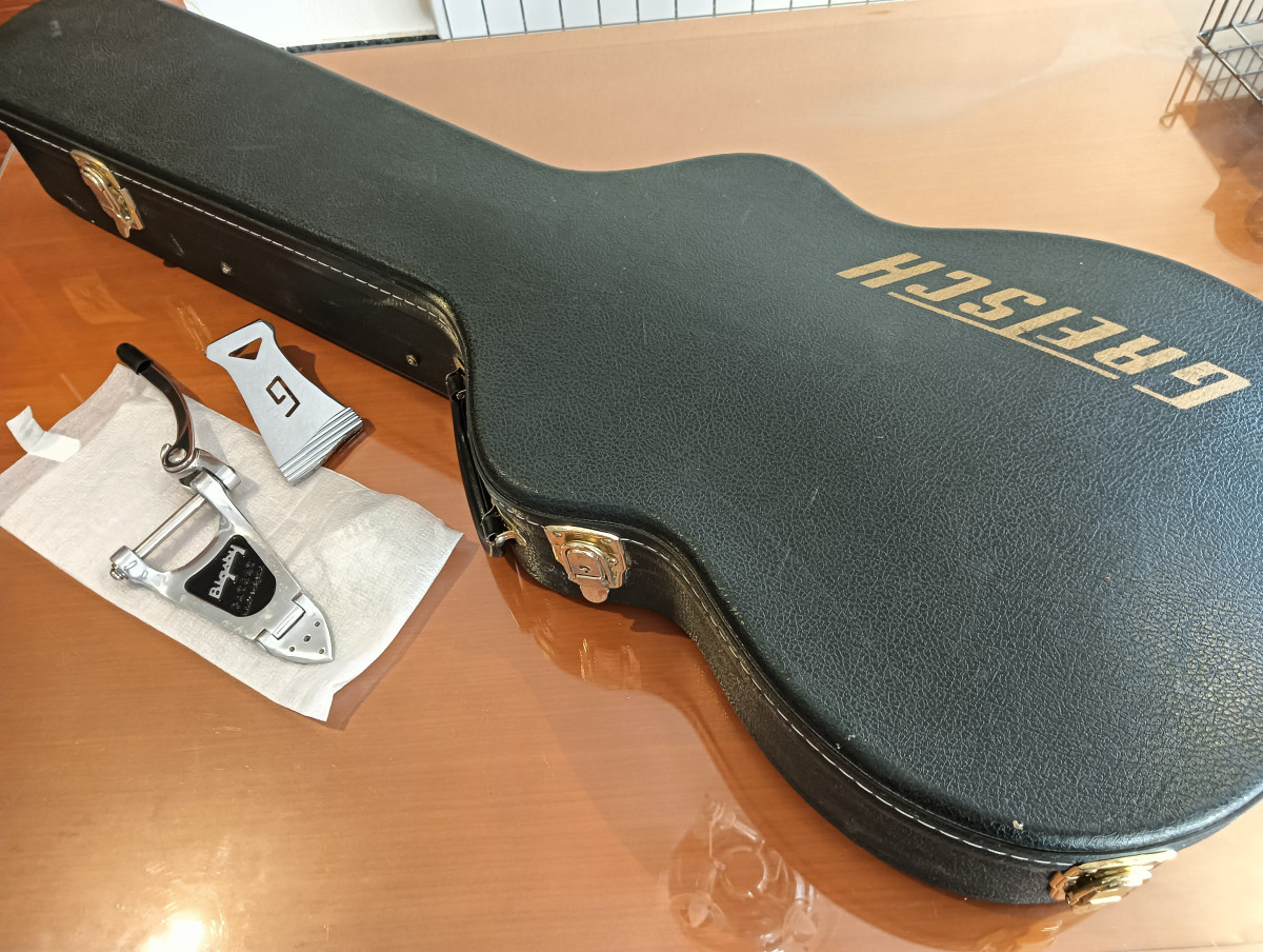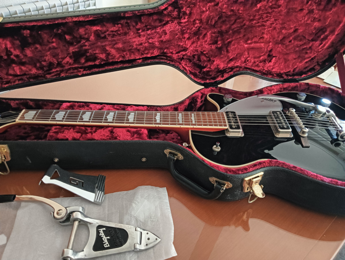 Fantástica Duo Jet con dynasonics, en la foto con bigsby modelo vintage 50s, con brazo fijo (chulísimo y muy cómodo). Puedo montar el bigsby original con brazo normal si la quieres toda se serie. También ofrezco la opción de cordal fijo si lo prefieres por 100 euros menos.