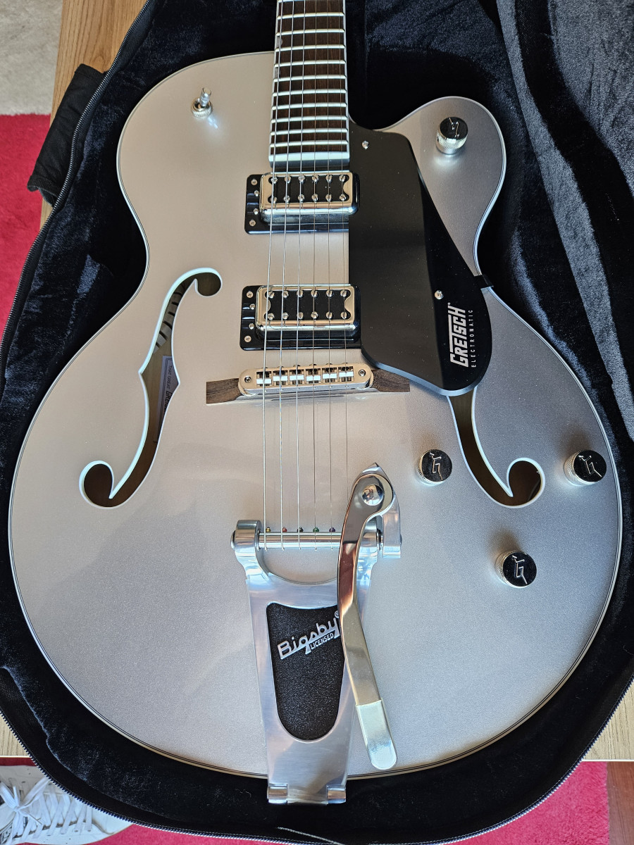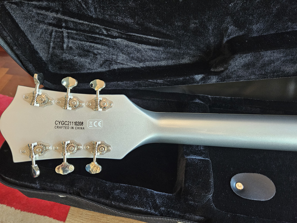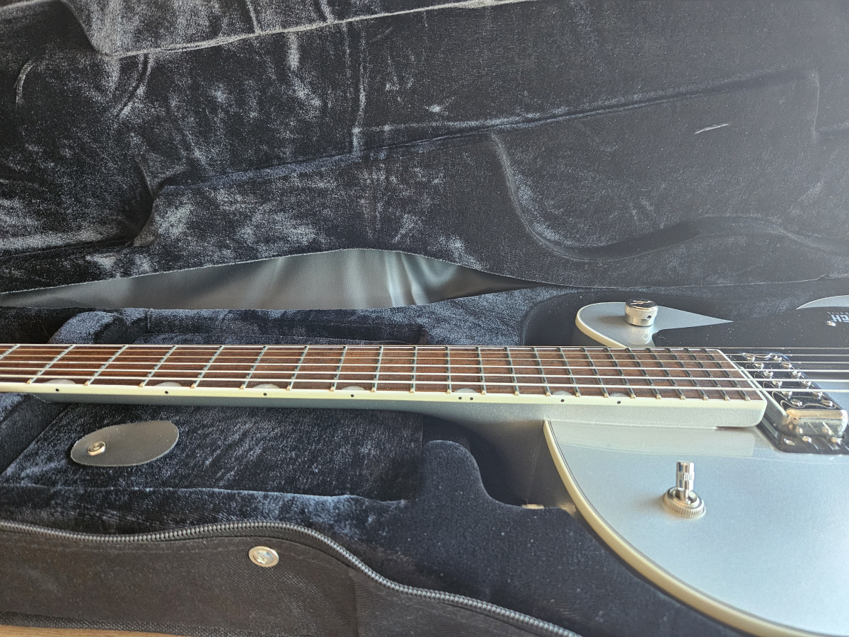 A estrenar. Comprada el mes pasado y llevada al luthier para cambio de cuerdas y puesta a punto. El selector de pastillas fallaba un poco y los trastes necesitaban un pulido tal y como venía de fábrica. Ahora no solo luce impresionante, sino que suena y se toca increíble. Esta guitarra vale más de lo que cuesta y mi luthier de confianza se sorprendió de lo bien que aguanta la afinación para llevar bigsby (aún con su plástico protector de fábrica).