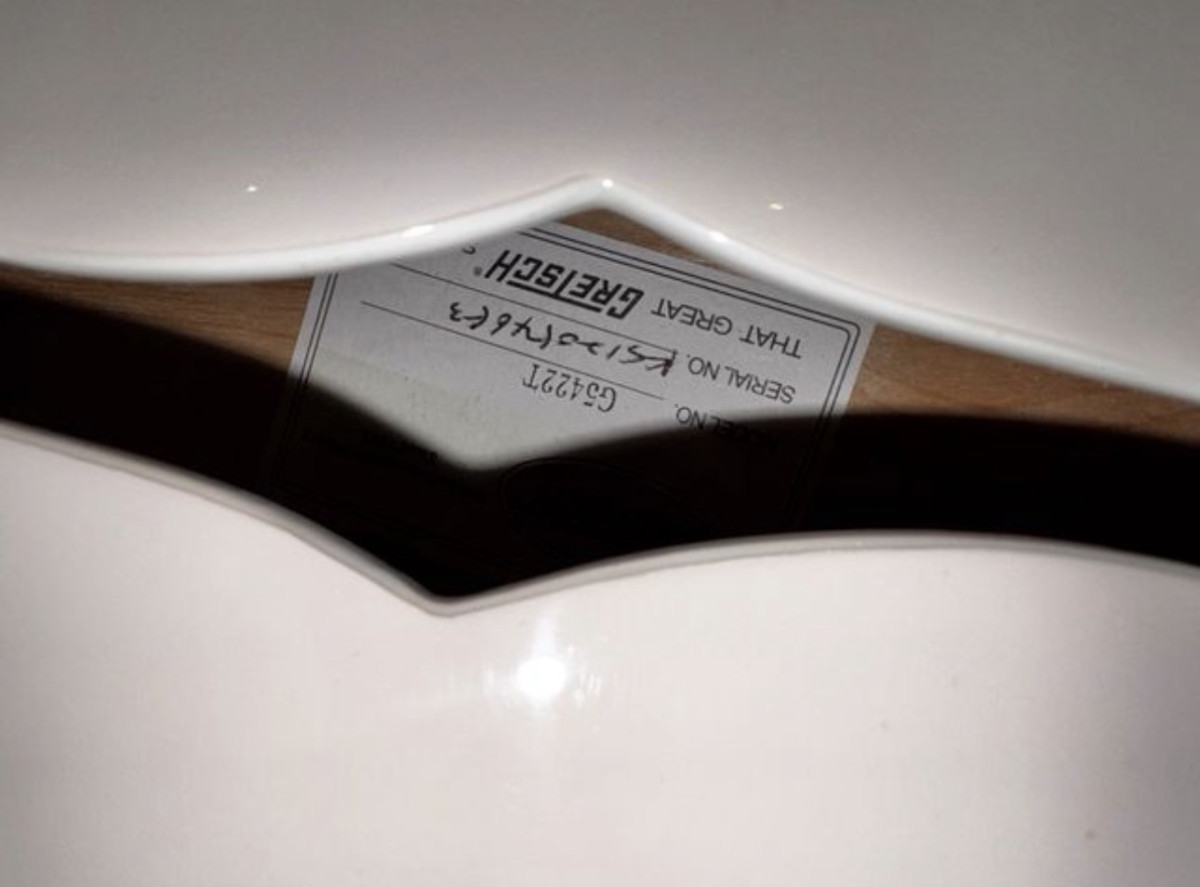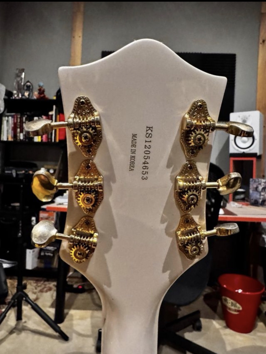 Guitarra eléctrica Gretsch G5422T, fabricada en Corea en el año 2012. Acabado blanco y detalles dorados.