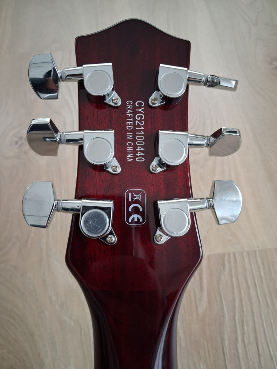 Serie Electromatic, cuerpo y mástil de caoba, tapa de arce, diapasón de laurel con incrustaciones de Pearloid Neo-Classic Thumbnail, perfil del mástil Thin U, radio del diapasón: 305 mm (12"), anchura de cejuela de 42,86 mm (1,6875"), 22 trastes Medium Jumbo, dos pastillas Black Top Broad ́Tron Humbucker, 2 controles de volumen, 1 regulador de volumen Master y un regulador Treble Bleed, 1 regulador de tono Master, conmutador de pastillas de 3 vías,...