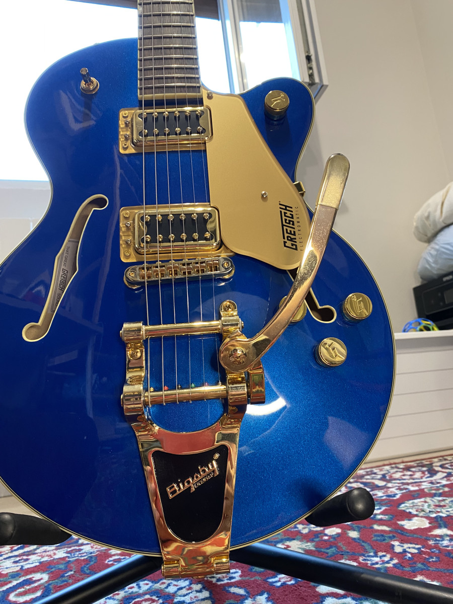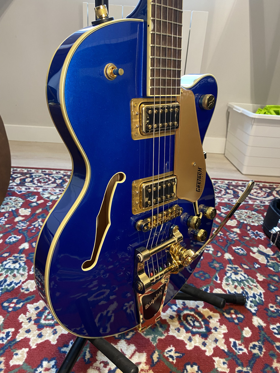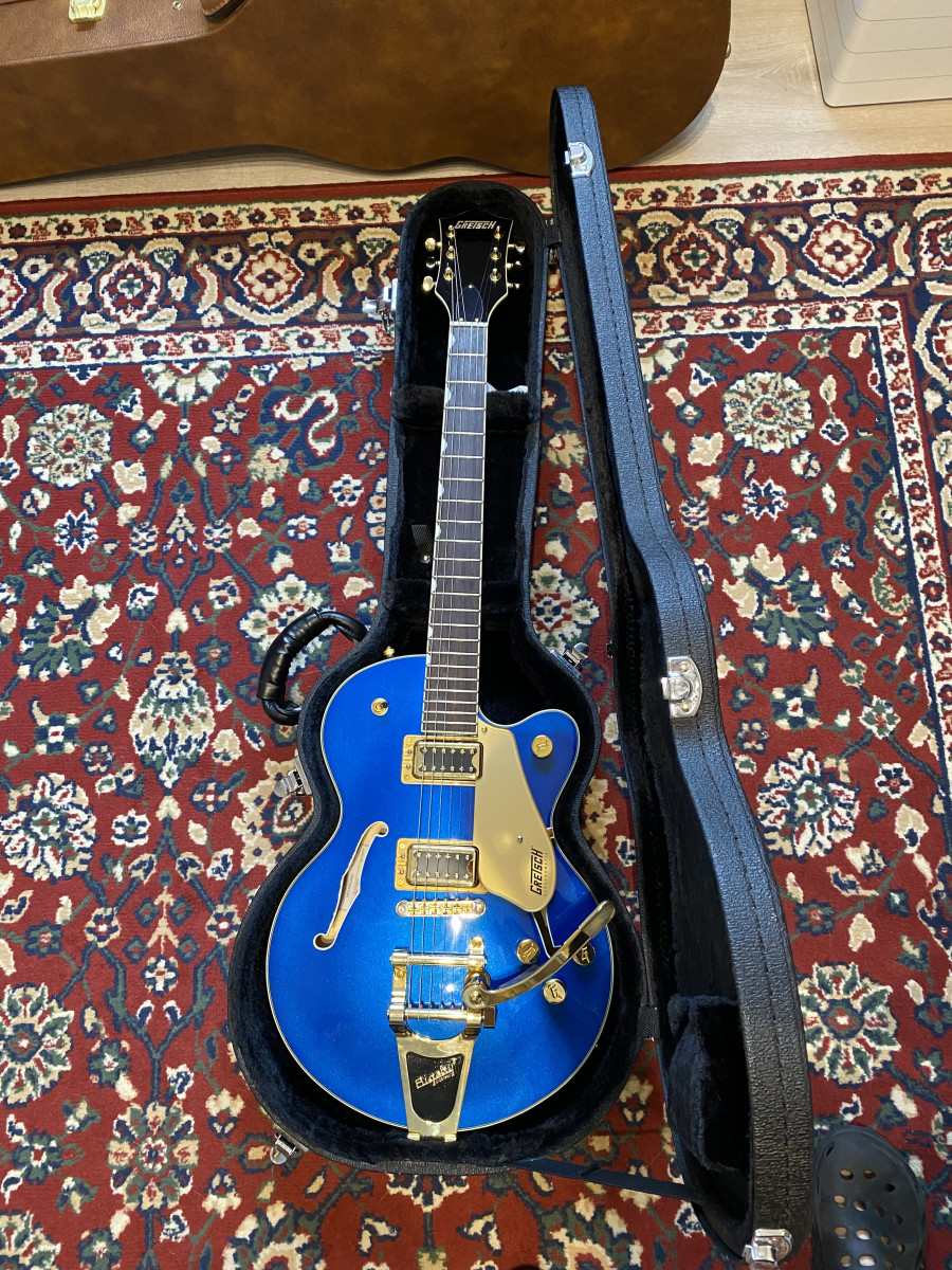 Guitarra electrica Gretsch G5655TG Electromatic en perfecto estado. Cuerpo semi-hueca con bloque central. Cuerpo y mastil de arce con diapason de laurel. Bigsby B70 con estuche a medida para ella. Recien ajustada con cuerdas nuevas. Nueva a 885€ en thomann sin estuche.