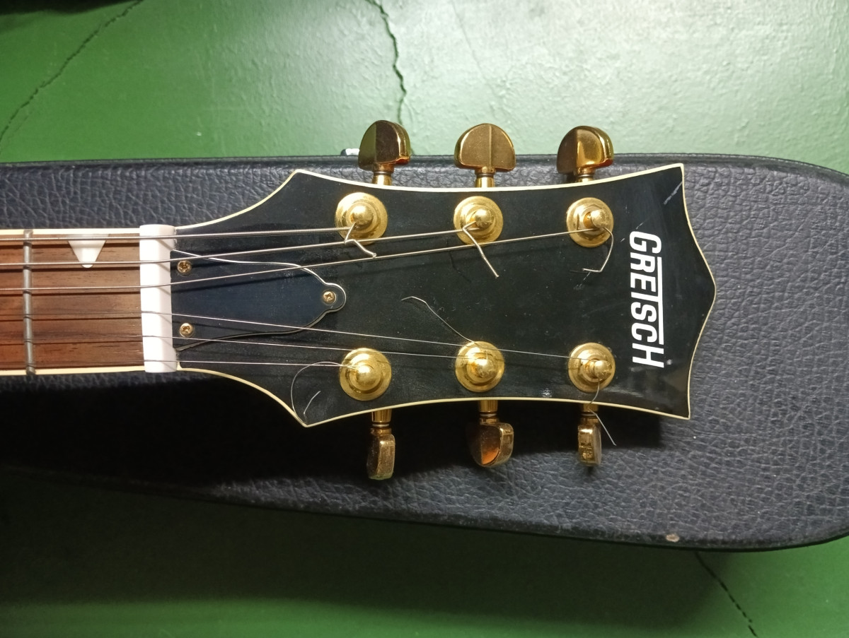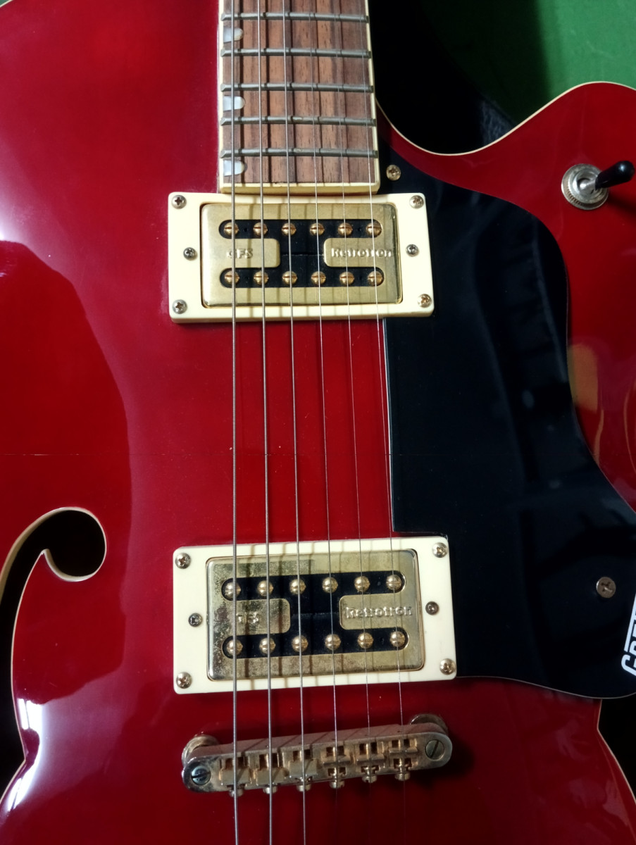 Es un mueble que alguien montó al estilo de una Gretsch. Tiene pastillas GFS Retrotron (podéis buscar opiniones en Google) y es bastante cómoda. No se ha tocado en quince/veinte años fácilmente. El estuche NO está incluido.