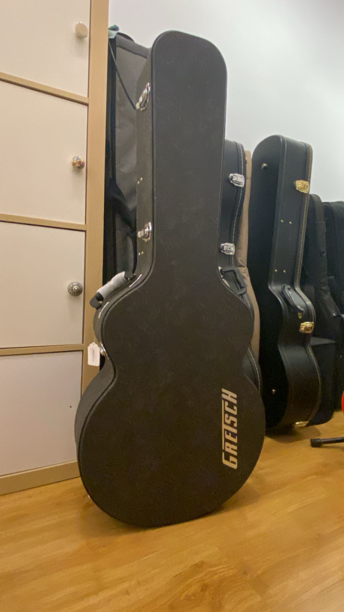 Nueva, tocada dos ratos. Tiene aún el plástico protector en el bigsby. Ataque de Gas pero me gustan las Gretsch con la escala más corta…