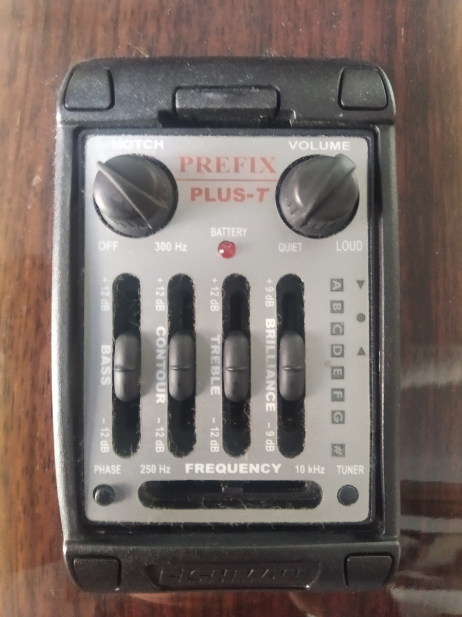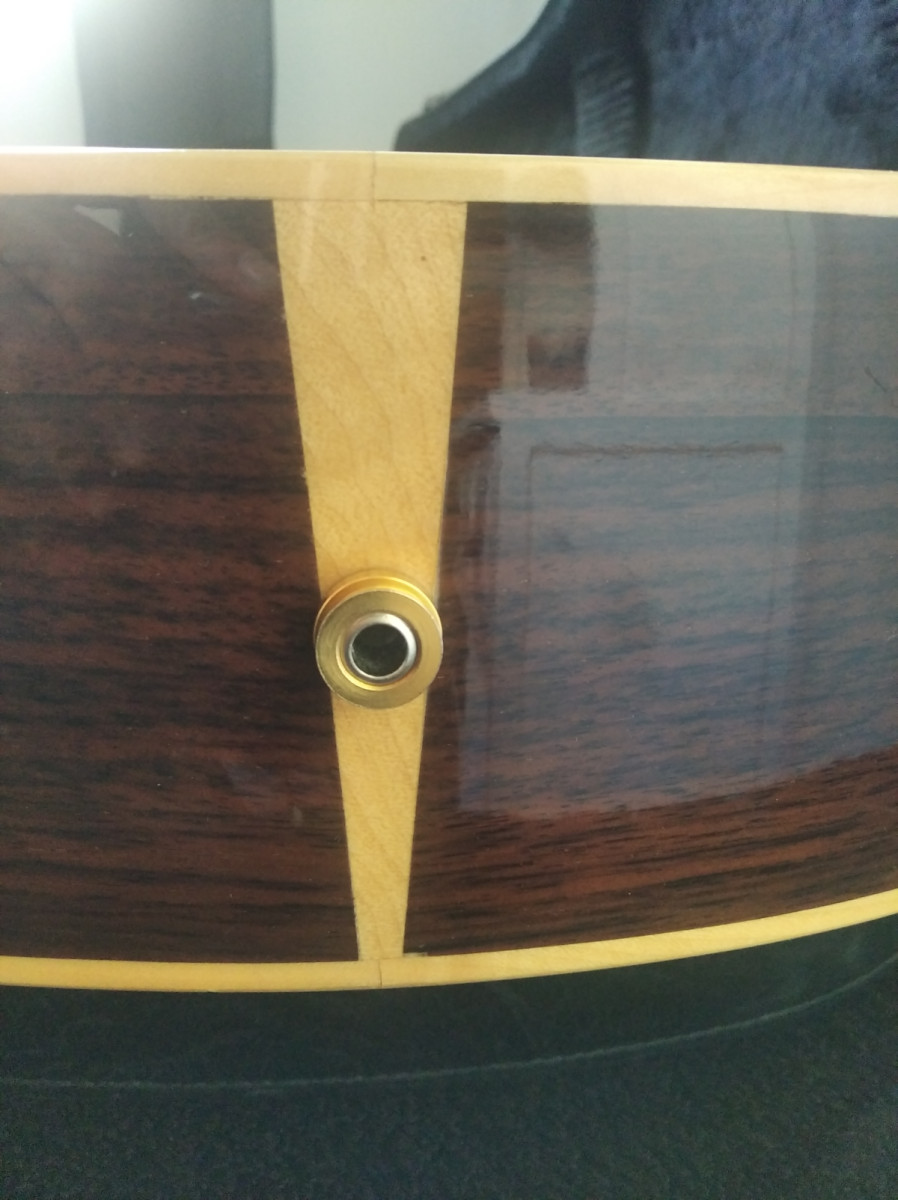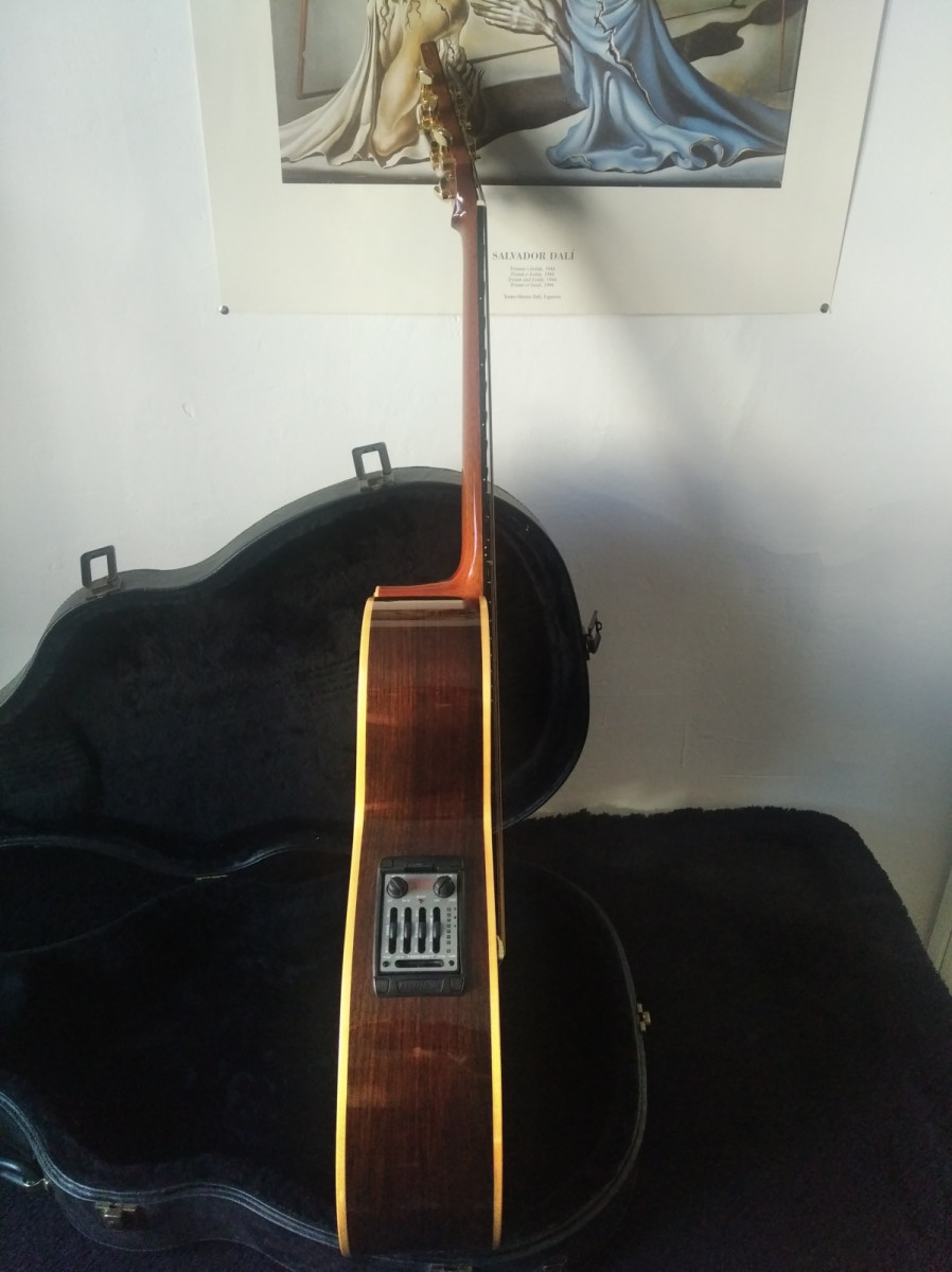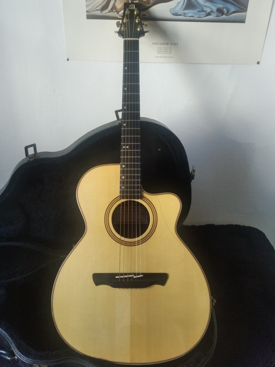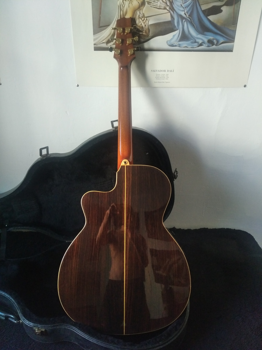 Tapa maciza de cedro. Aros y fondo de palosanto macizo. Diapasón de ébano.