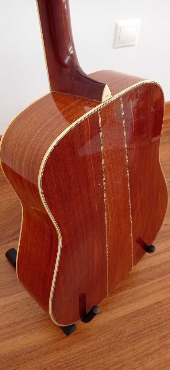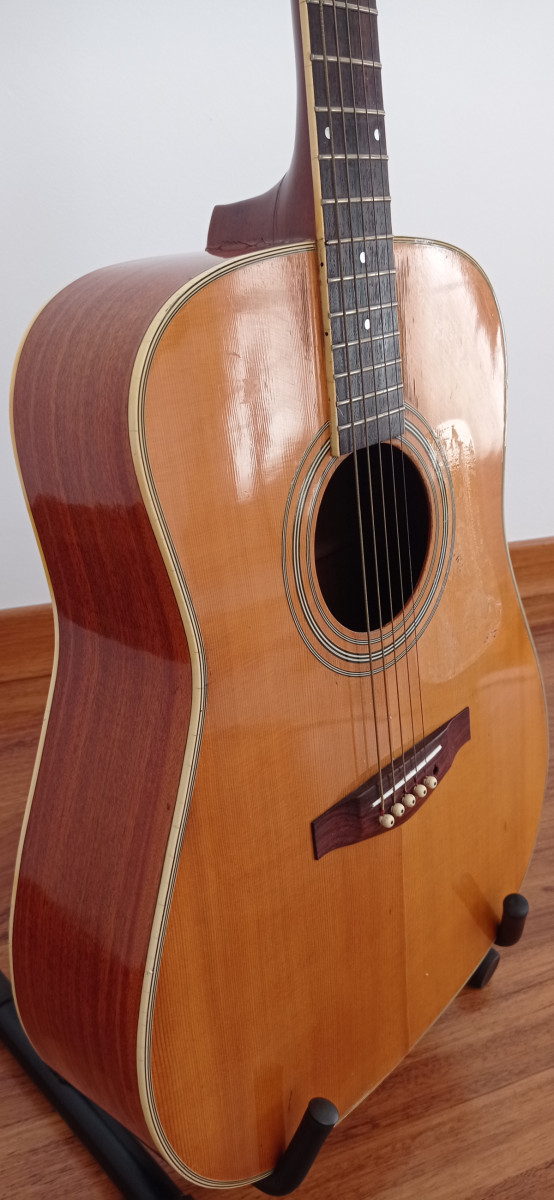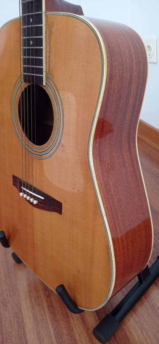 Guitarra acústica de la marca Jim Deacon (en base a los restos de la pegatina interior prácticamente perdida) modelo JDX?. Signos de uso (ver fotografías) pero totalmente funcional y mucha vida por delante como primera guitarra de aprendizaje o de batalla. Buenas maderas, gran sonoridad y con una alta relación calidad precio. Requiere ajustes normales, cambio de cuerdas, reponer pin y colocar protector de pua (si se desea). Más fotos y vídeos por WhatsApp. Hago envío o entrega en mano en Iniesta Albacete y Valencia o área de servicio de la autovía A-3 si te desplazas entre Madrid-Valencia.