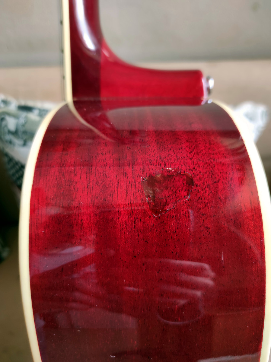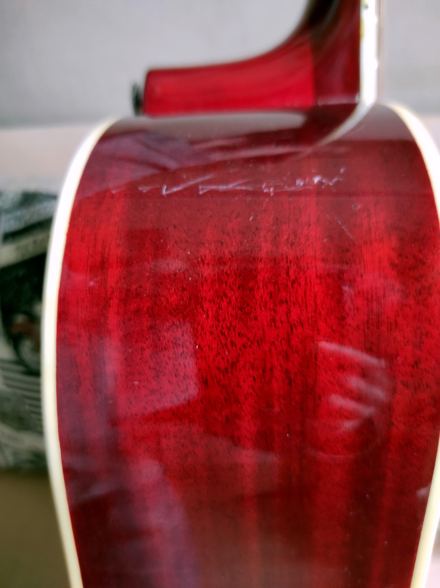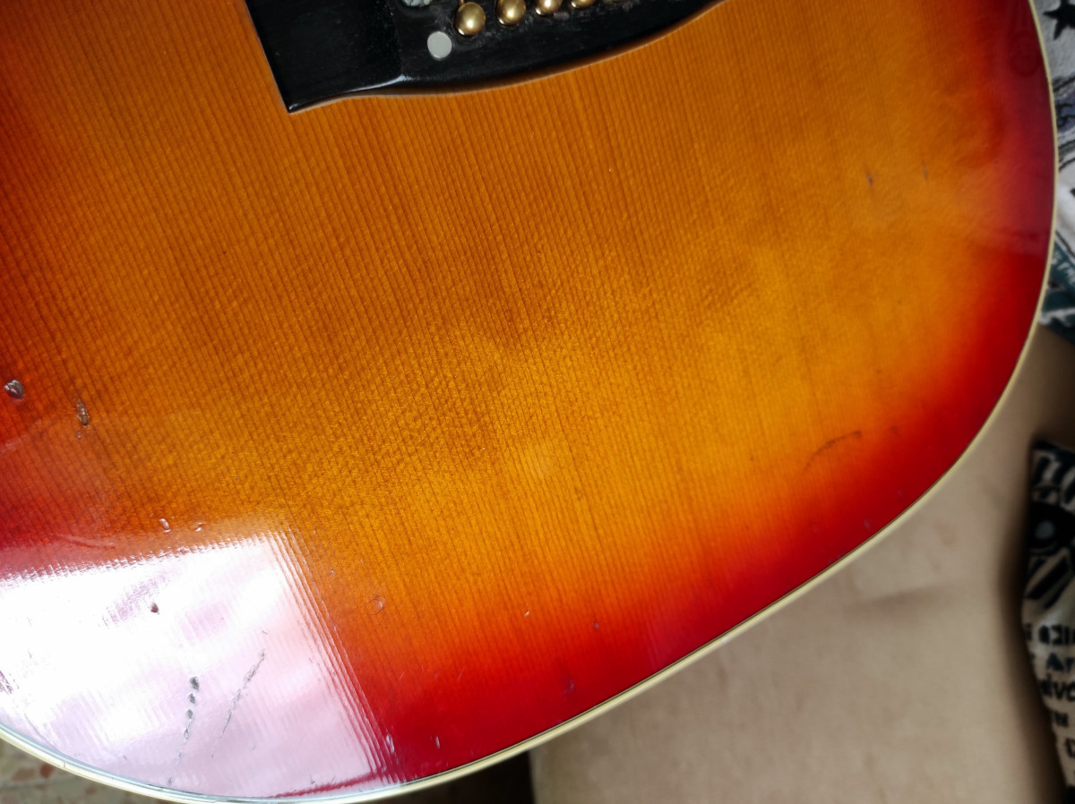 La guitarra se encuentra en muy buen estado (a efectos de tocabilidad y sonido mucho mejor que nueva) pero obviamente tiene sus "heridas de guerra" dado que tiene más años que yo, siendo todas ellas muy irrelevantes (los típicos "dings" más bien pequeños y algunos arañazos de poca importancia) a excepción de un golpe en la parte superior del lateral derecho que fue reparado de manera bastante discreta (en las fotos "canta" más porque he querido que se viera con claridad lo que hay). Creo que la parte superior de un lateral es, dentro de todas las partes del cuerpo de una guitarra de caja hueca que se pueden llevar un golpe, la que menos influye en el sonido y la resonancia del instrumento. Por lo demás no hay gran cosa que reseñar, la tapa se ha abovedado un poco entre el puente y la culata pero esto es muy típico (por no decir inevitable) en guitarras clásicas y acústicas con cierta edad, no es algo exagerado que comprometa la altura de cuerdas en el puente y no ha ido a más en todos los años que la he tenido (el refuerzo en forma de X bajo el puente se ve muy sólido).