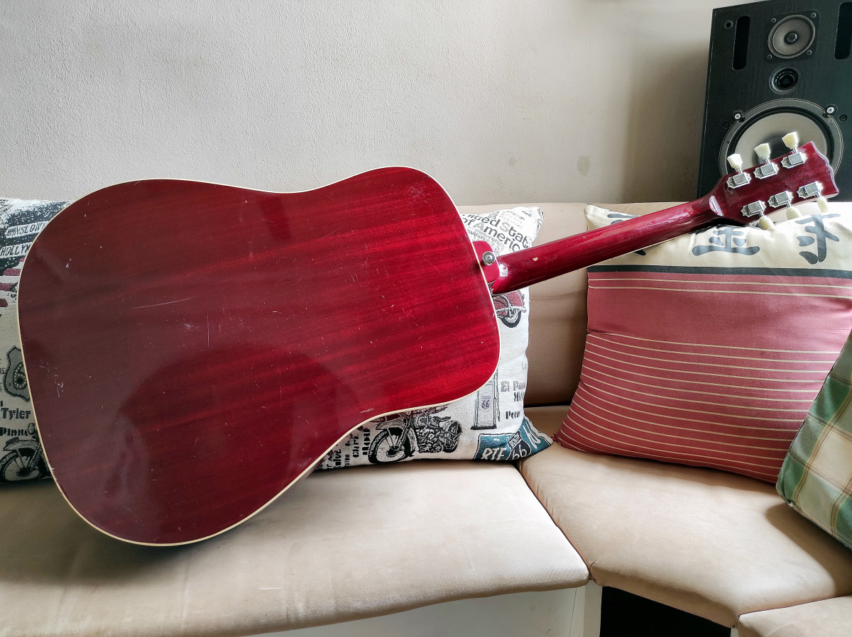 Fiel réplica de la Gibson Hummingbird (guitarra "dreadnought" de caja grande) hecha en Japón en los años 70 con las maderas correctas. Relic / envejecido natural moderado. El cambio o acondicionamiento de todos los componentes siguiendo las "specs" del diseño original se refleja en su sonido. Incluye estuche del mismo periodo con interior aterciopelado y amplio compartimento para accesorios.