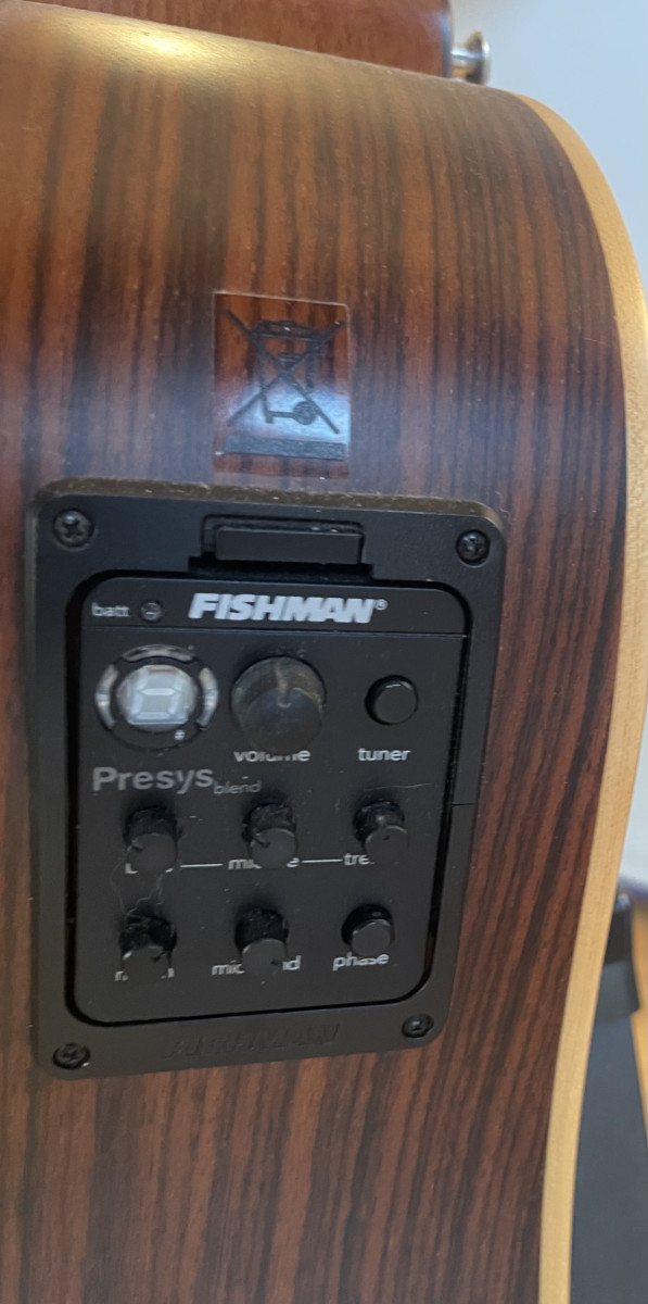 Equipo Fishman Presys Blend con doble sensor piezo + mic interno, que permite elegir sonido acústico, eléctrico, o mezcla de ambos .