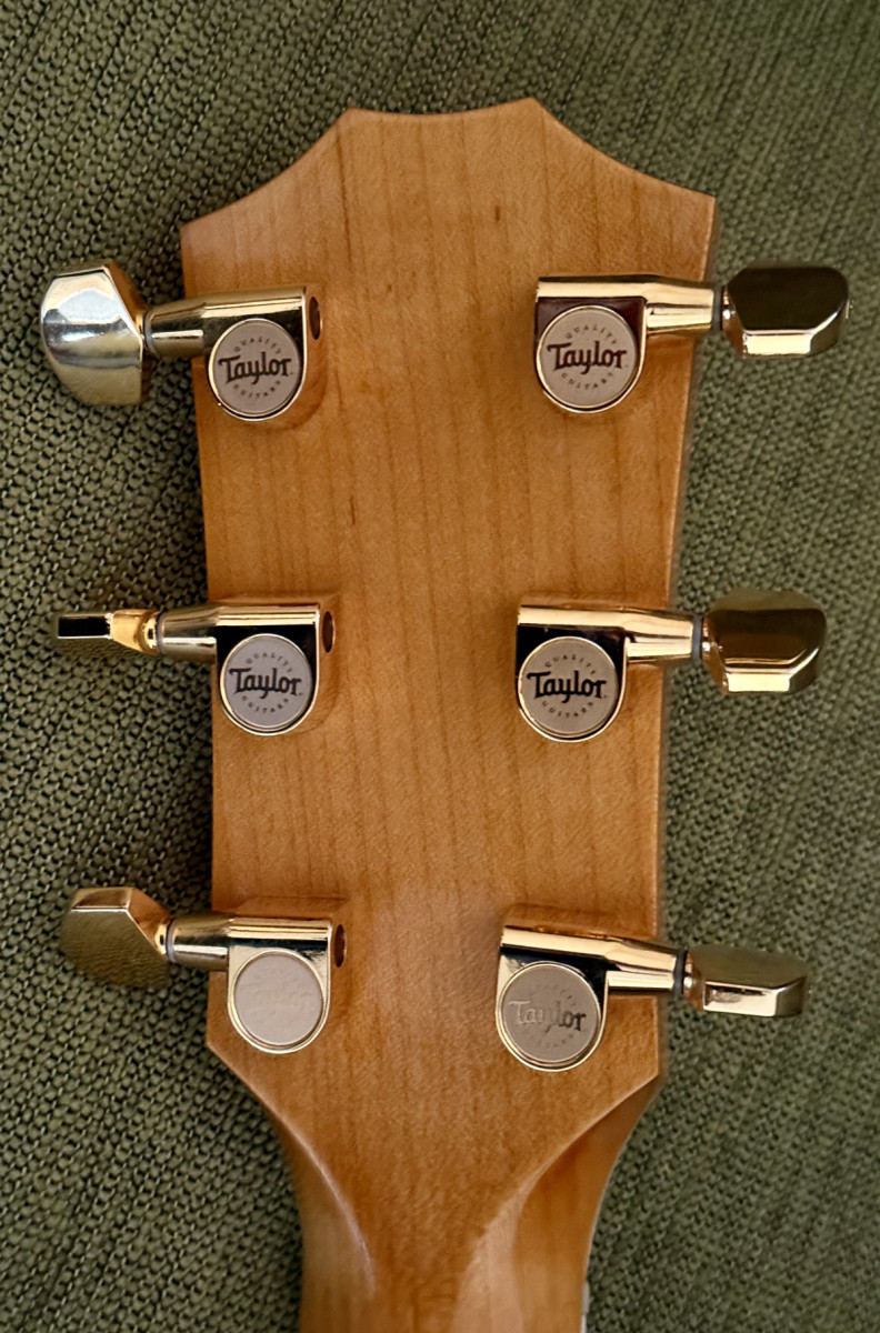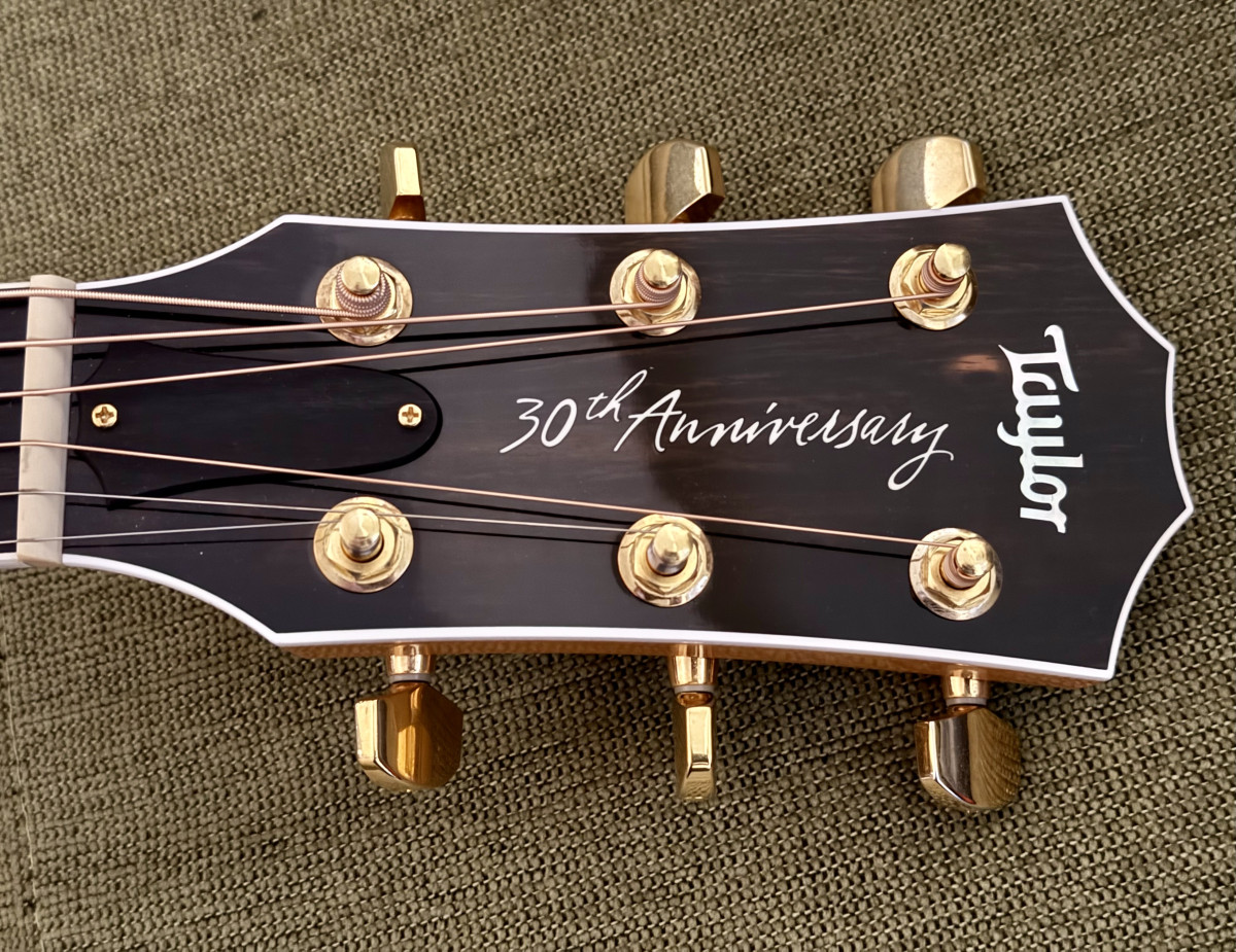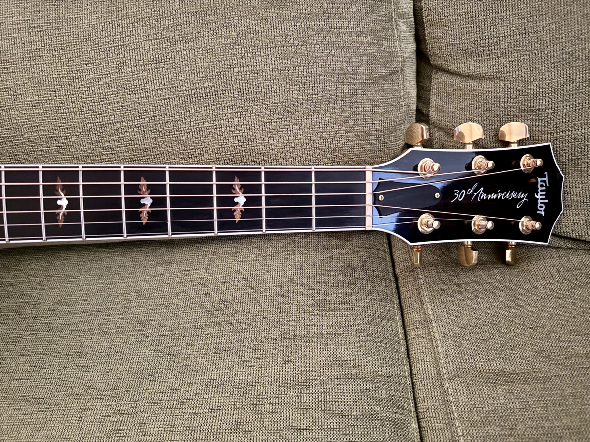 Mástil de arce suave en forma de V con ribetes blancos y puntos laterales negros. Diapasón de ébano con incrustaciones de hojas de abulón y madera de roble. Clavijero encuadernado con logo del 30 Aniversario. Afinadores Gold Taylor. Ancho de tuerca de 1 3/4 ". Longitud de escala de 25 1/2". El cuello es recto.