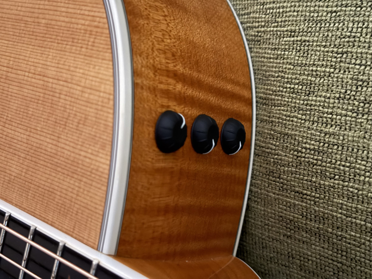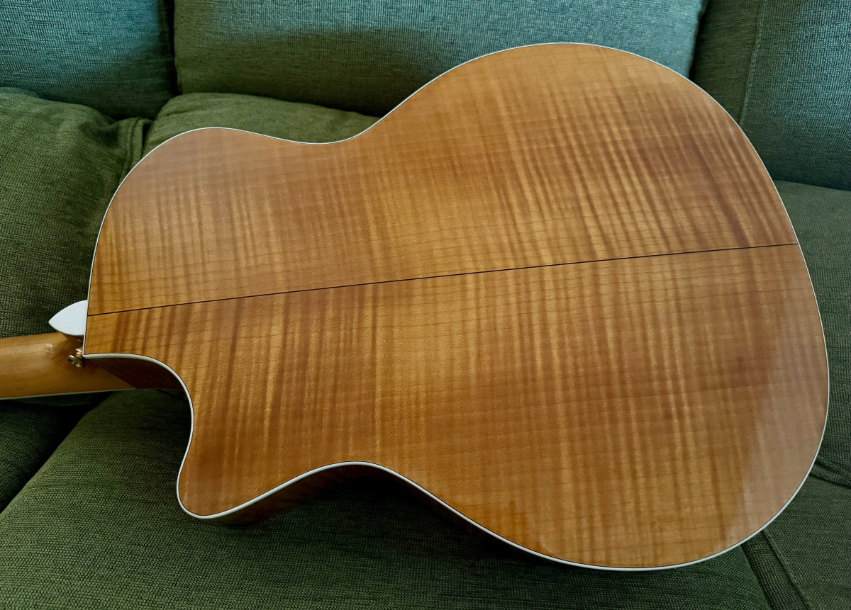 Cuerpo cutaway veneciano, Grand Auditorium en acabado natural. Tapa de abeto macizo con encuadernación de 6 capas. Puente de ébano y pasadores con montura compensada. Roseta de racimo de hojas de roble abulón. Aros y fondo de arce macizo flameado con fondo de 3 piezas. La guitarra pesa 2,41 kilos.