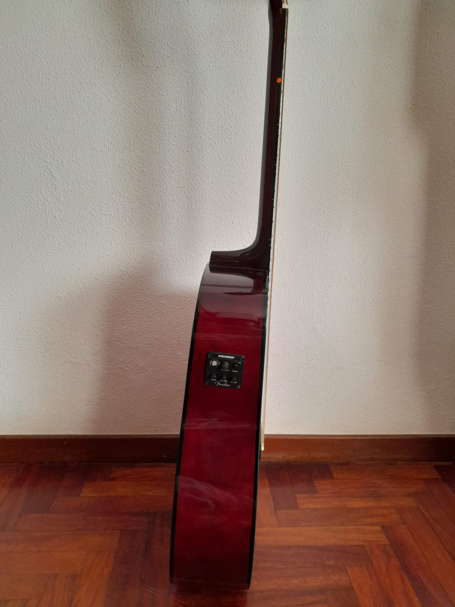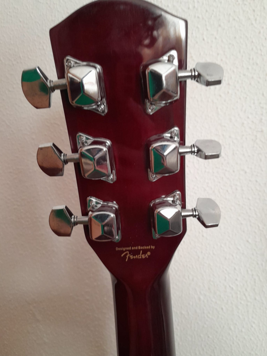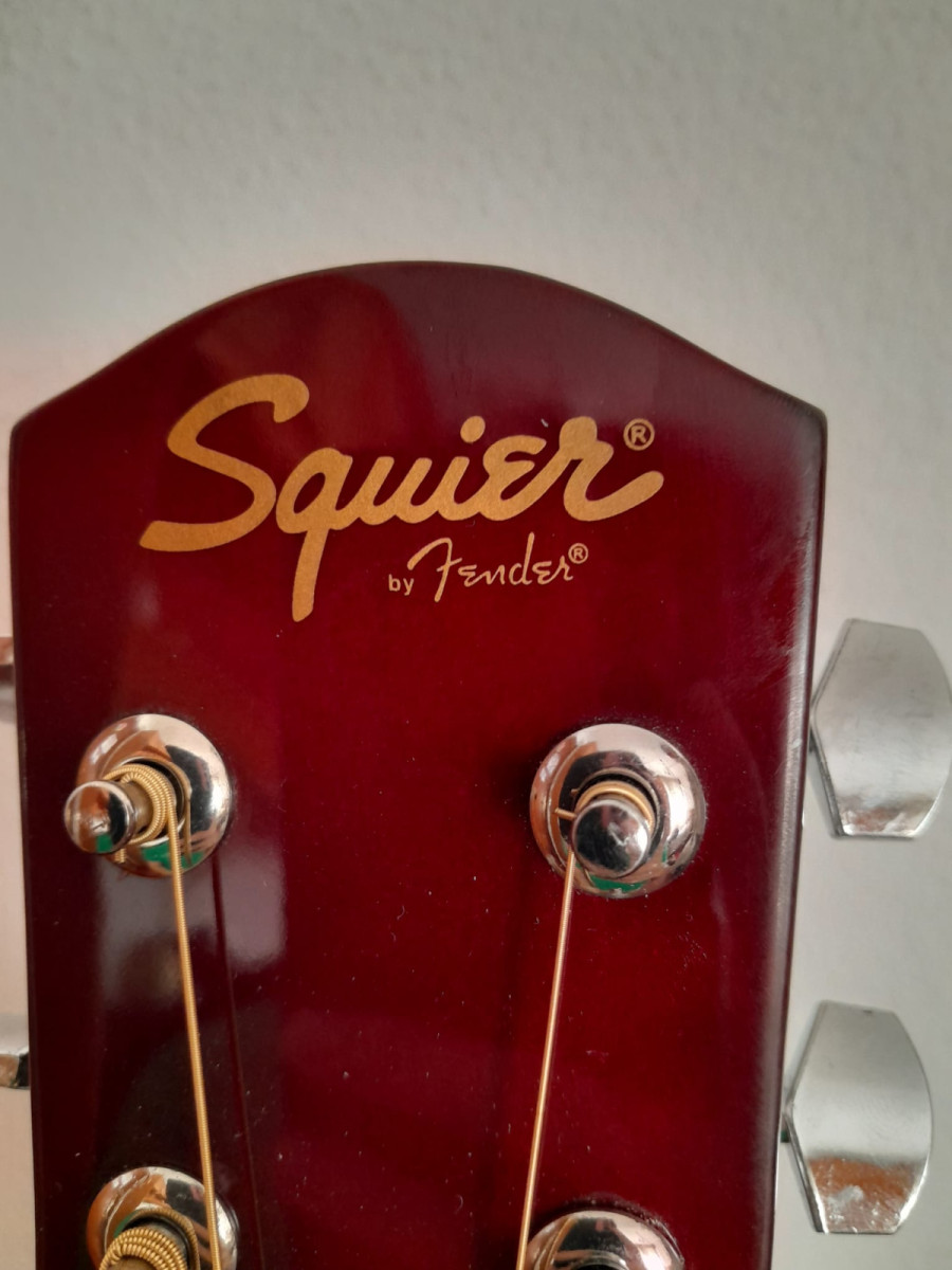 Es una guitarra de Squier. Tapa de pícea, el cuerpo y aros es de caoba, el mástil de nogal y el ancho de la cejuela en mm es de 43. Incluye funda.
