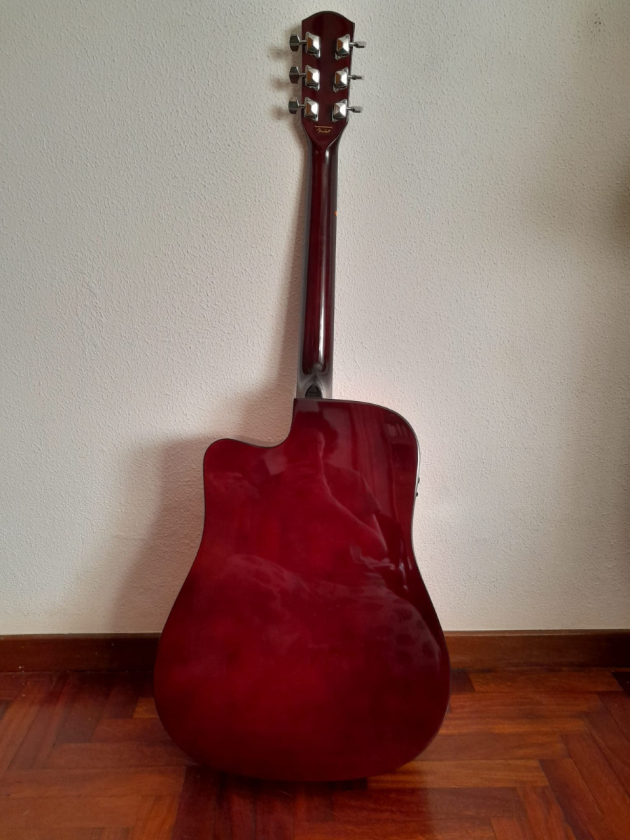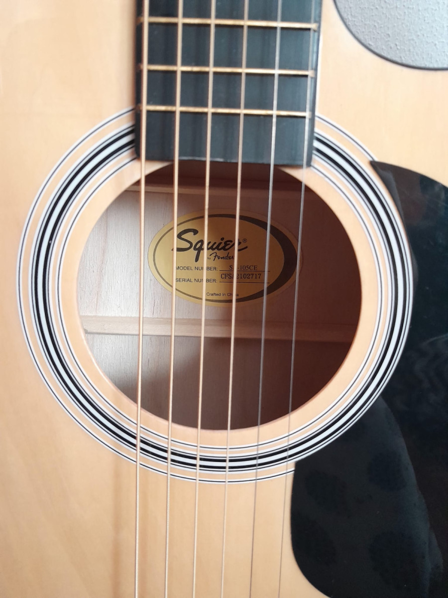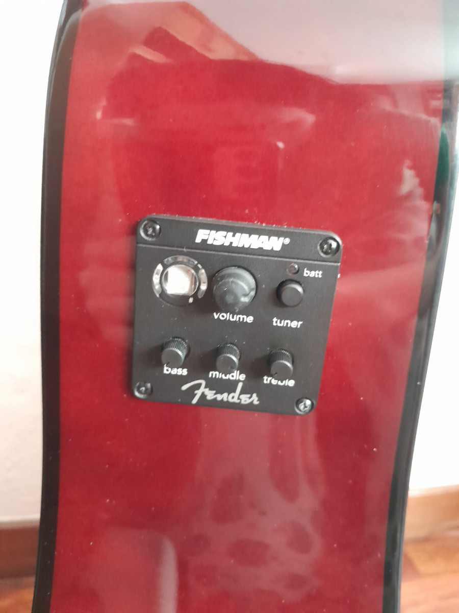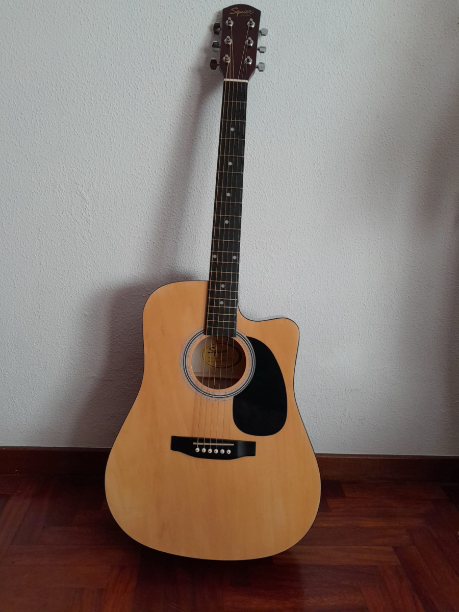 Es una guitarra de Squier. Tapa de pícea, el cuerpo y aros es de caoba, el mástil de nogal y el ancho de la cejuela en mm es de 43. Incluye funda.