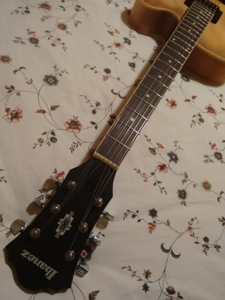 Comprada hace poco a un forero, ha sido un capricho y al final no la toco (soy bajista). Está prácticamente nueva. Tiene puestas cuerdas gorditas (Chromes 0,12''), pero incluyo un juego estándar de 0,10'' sin abrir.